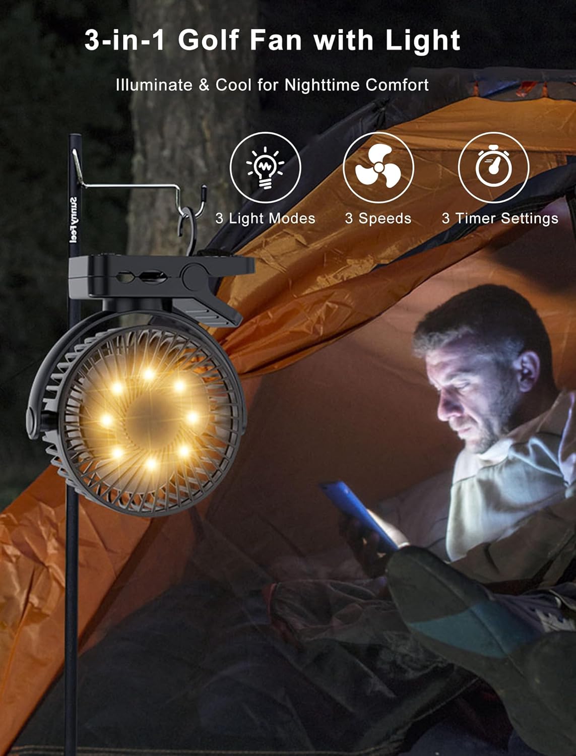 - 【Versatile for Multiple Uses & Lighting Options】This golf cart fan is designed to attach securely to any metal surface, making it perfect for golf cart accessories, forklifts, cruise ships, workbenches, kitchens, gym equipment, and even trucks or RVs. The 3-level adjustable LED light makes it an excellent cooling solution for camping, fishing, or power outages—also a great summer golf gift for family and friends!