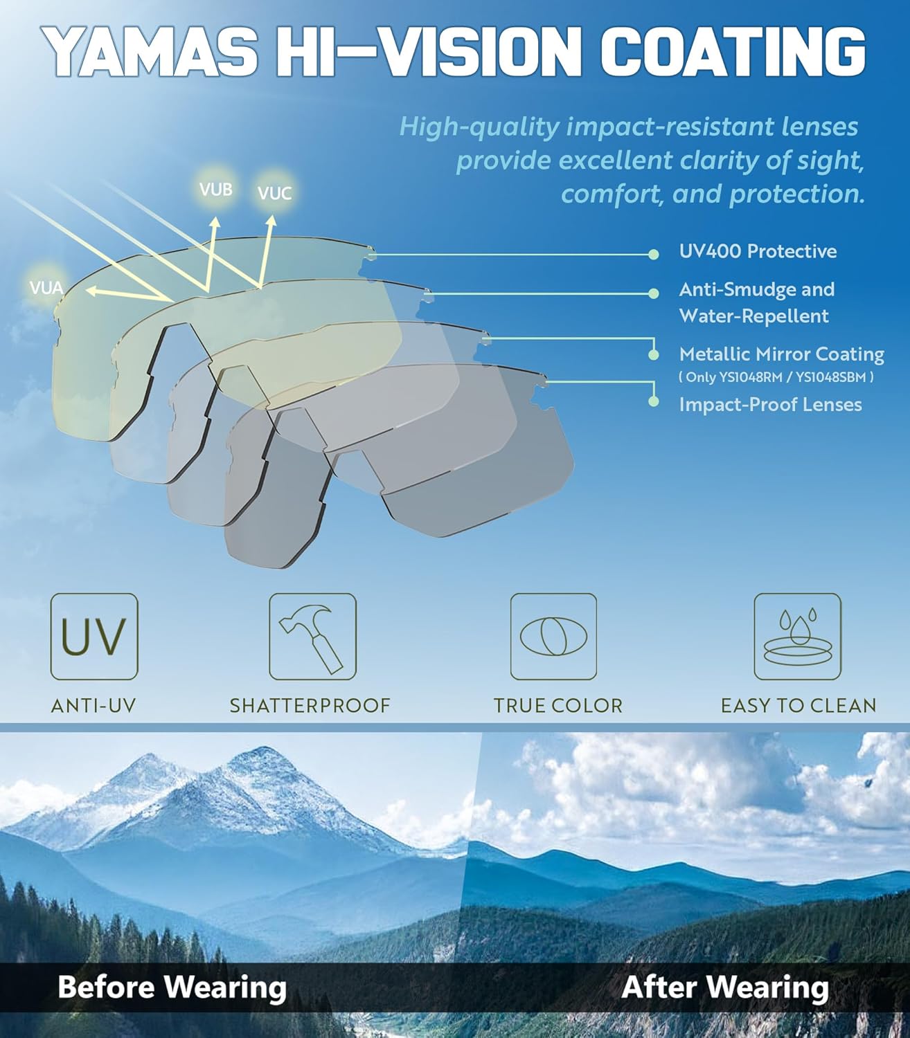 - Streamlined Style, Yet Durable: YAMAS YS1048RM is a streamlined style; these cycling sunglasses not only look sleek but also reduce wind resistance. Plus, their durable construction ensures they can withstand your rides.