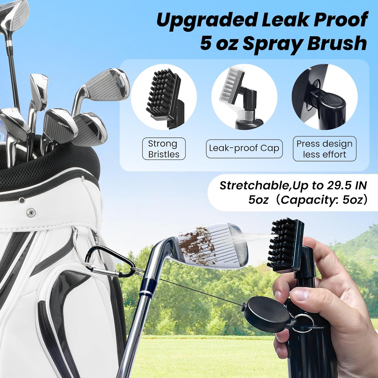 - 【Upgraded Leak-proof Spray Golf Club Brush】5 oz golf club cleaner is designed with a press-spray design that doesn't leak. Powerful and controllable water flow allows you to use more rounds on the field. Equipped with powerful nylon comb bristles for durability and a large cleaning area. It can switch between wash and dry brushing to easily and quickly clean the entire club head