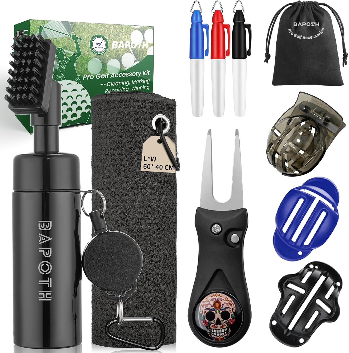 - 【Essential Golf Accessories and Gifts】The 5-in-1 golf accessories is designed to enhance performance on the course. Golf club brush and golf towel keep club grooves clean, which is one of the most important parts of winning in golf. The golf ball marker aids in aiming and improves your putting skills. The golf repair tool with magnetic marker helps mark the ball’s position and fix green divots—both essential elements of golf etiquette.With gift box, perfect for fathers, husbands,etc