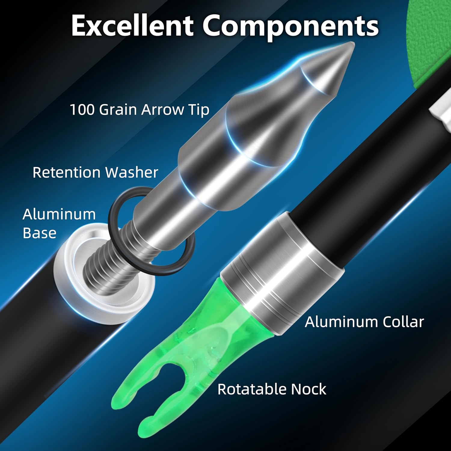 - Excellent Materials: Precision carbon shaft arrows. The removable stainless steel point is very sturdy. Comes with the most common 100-grain arrow tip which is tightened enough and could be replaced by other types easily.