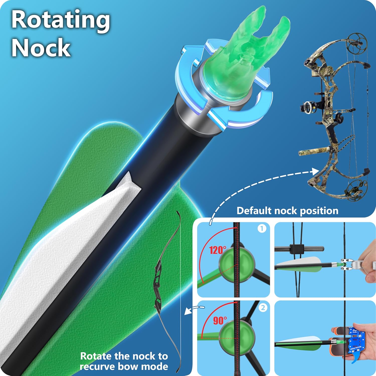 - Default compound bow style nock position. You can adjust the nock direction to fit for recurve bow and traditional bow.Color Box package with an arrow use guide on the back.