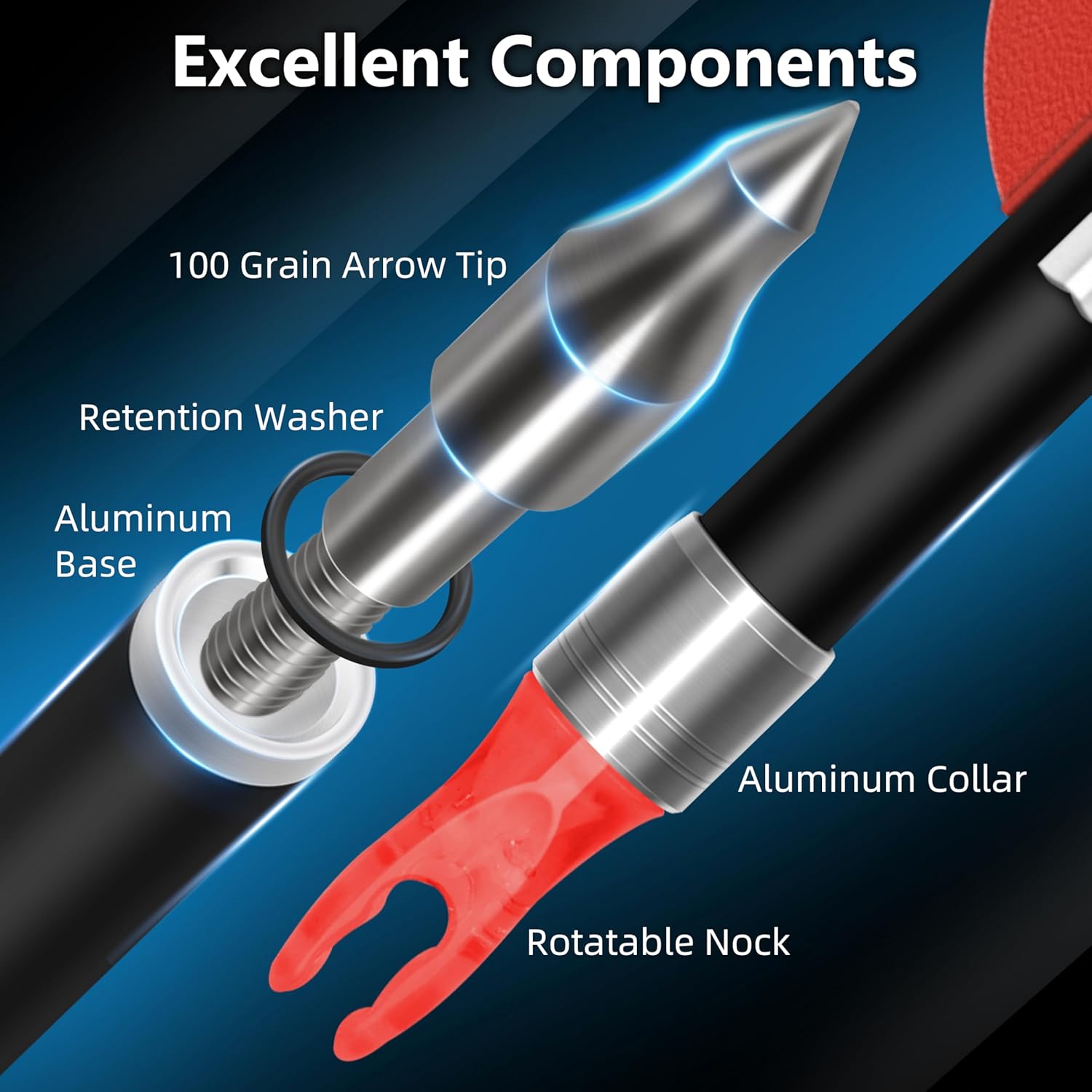 • Safety and Stability: An special O ring to keep the tip secure on the arrow to avid tip loose when pulling out from the arrow target. An aluminum ring on the nock side to avoid arrow crack which may hurt archer's hand.