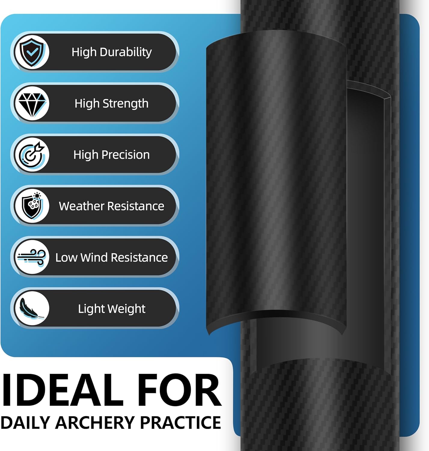 • Excellent Materials: Precision carbon shaft arrows. The removable stainless steel point is very sturdy. Comes with the most common 100-grain arrow tip which is tightened enough and could be replaced by other types easily.