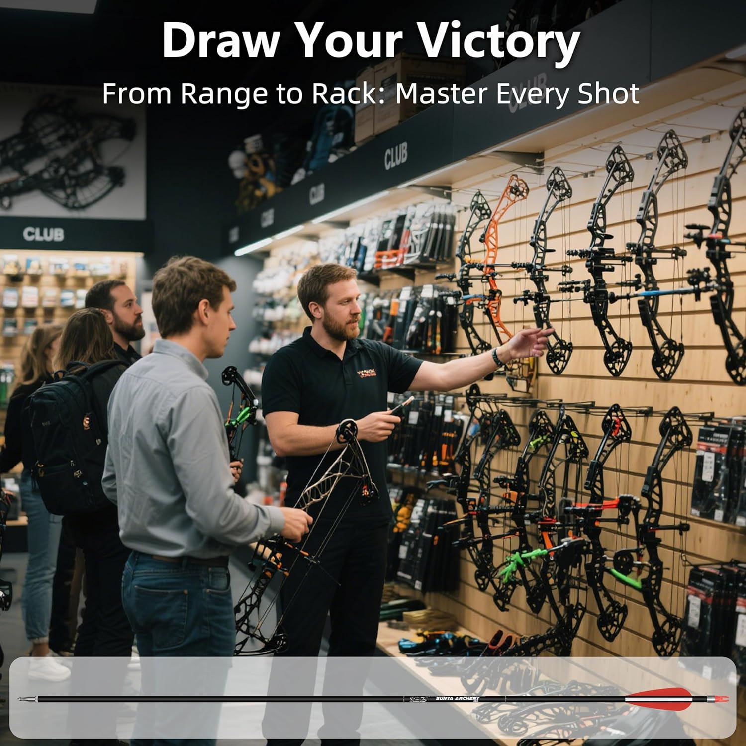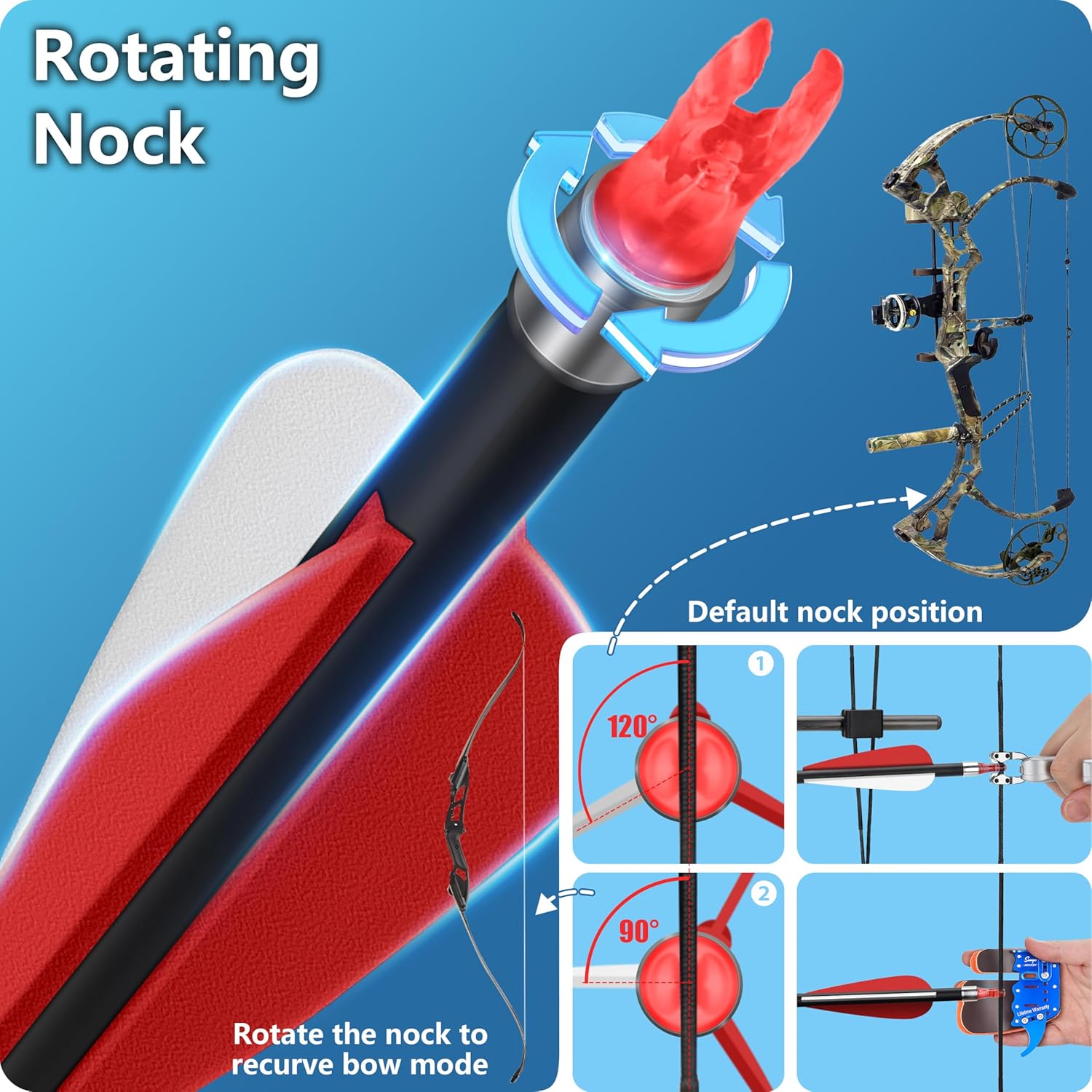 • Default compound bow style nock position. You can adjust the nock direction to fit for recurve bow and traditional bow.Color Box package with an arrow use guide on the back.