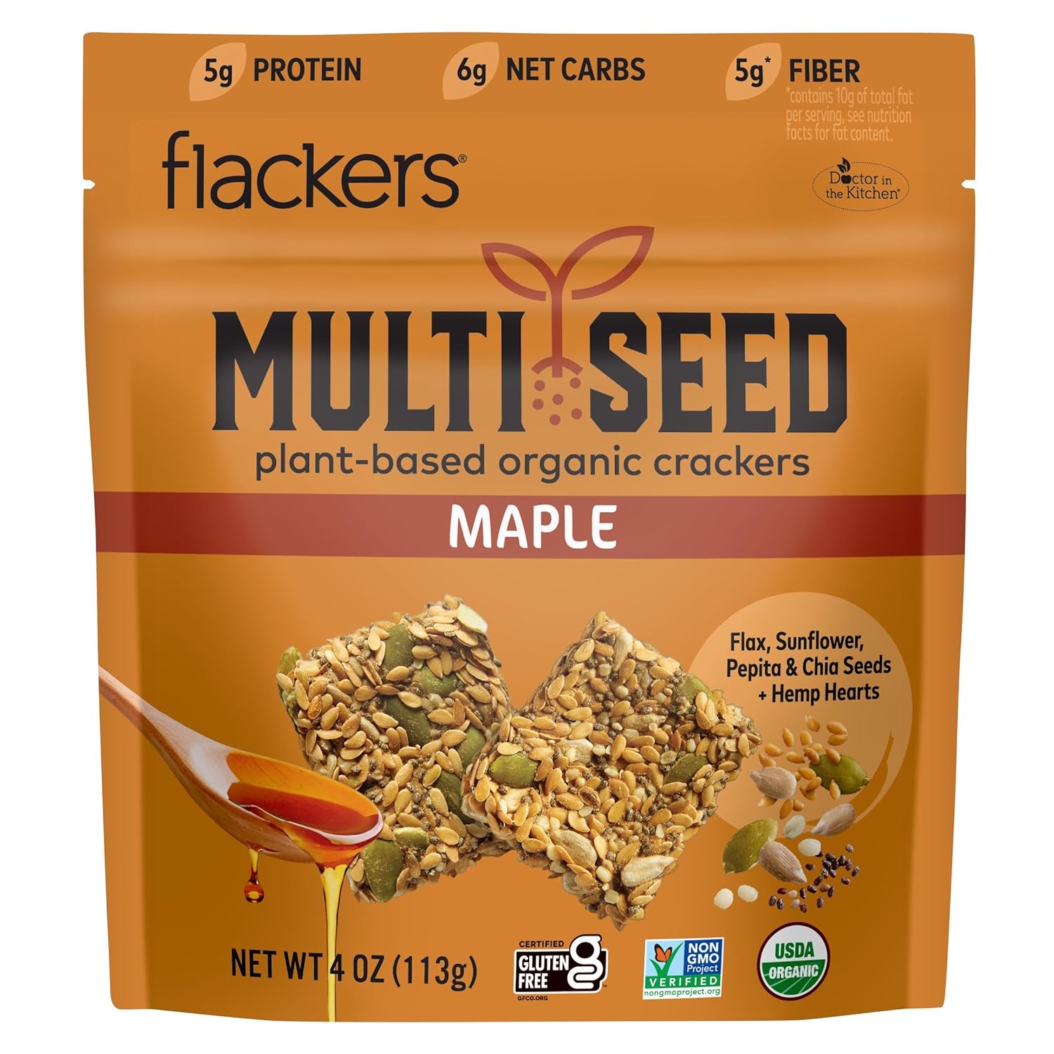 Flackers Organic Maple Multi-Seed Crackers, 4 Ounce 6-Pack, Gluten Free, Non GMO, Vegan, Keto Snack, 5g Protein, 5g Fiber, 6g Net Carbs