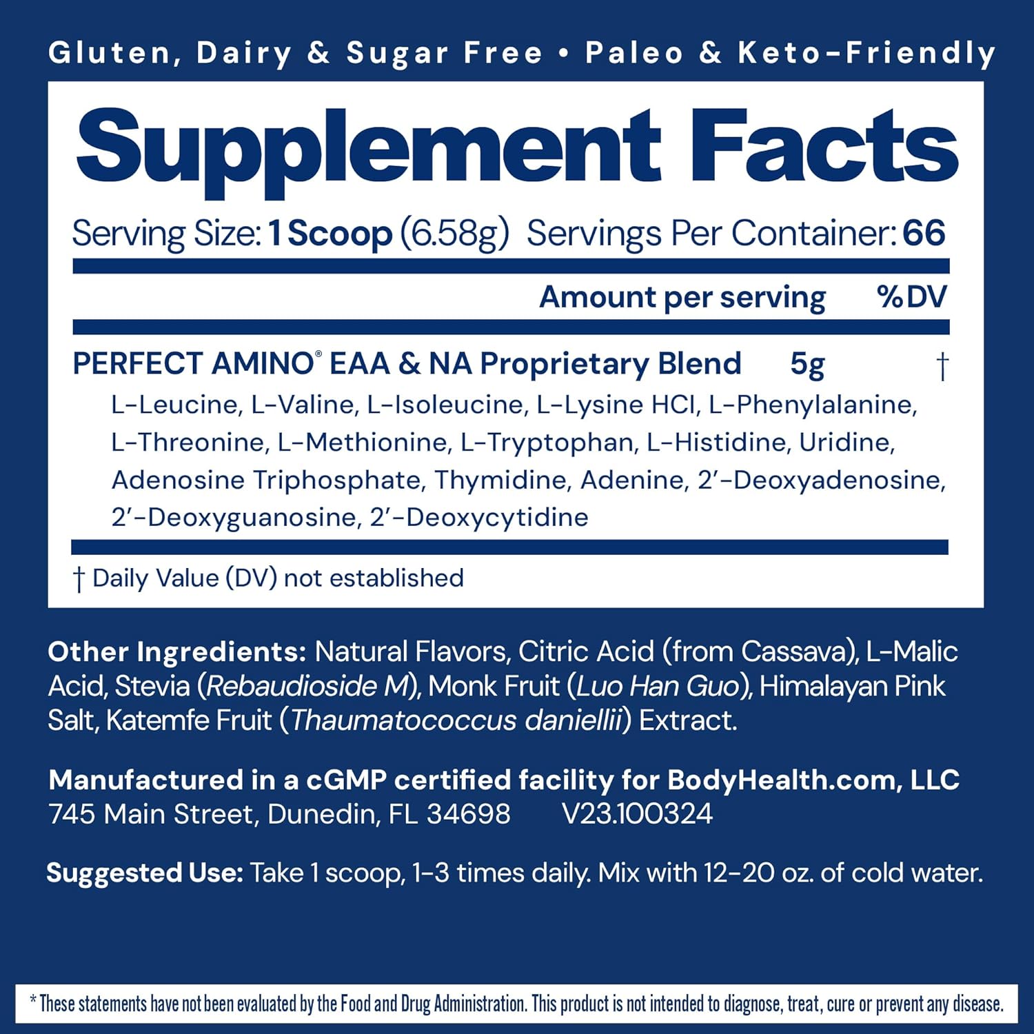 BodyHealth PerfectAmino Powder - BCAA and EAA Powder for Pre and Post Workout - Amino Acid Energy Drink to Support Lean Muscle and Recovery - NSF Certified for Sport - Mixed Berry - 66 Servings