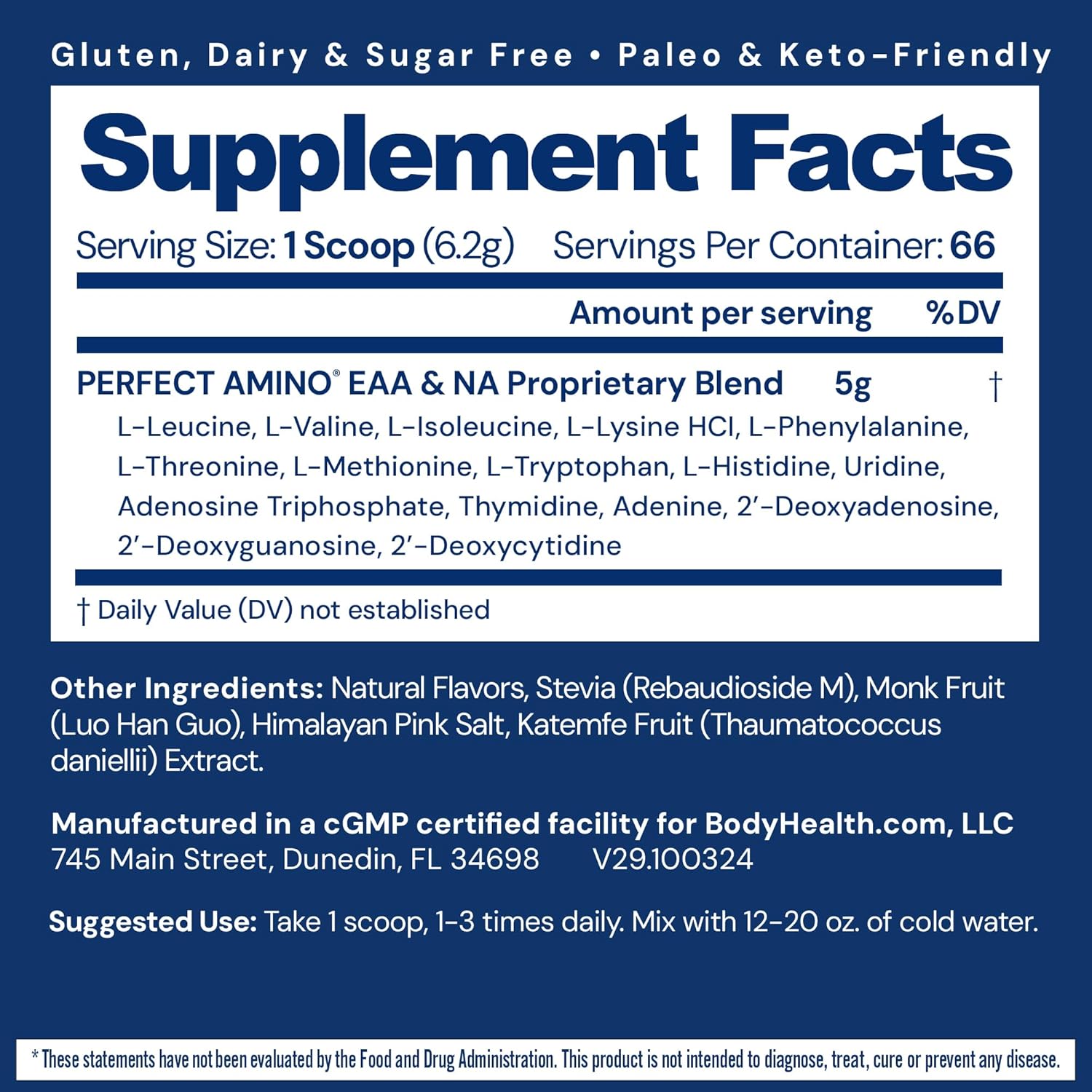 BodyHealth PerfectAmino Powder - BCAA and EAA Powder for Pre and Post Workout - Amino Acid Energy Drink to Support Lean Muscle and Recovery - NSF Certified for Sport - Vanilla - 66 Servings