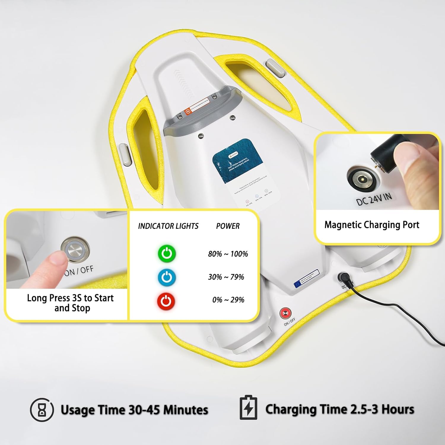 - Large-capacity battery: Electric swimming Pool Float has a built-in 24V/4.6Ah battery, with a comprehensive battery life of up to 45 minutes and a charging time of only 2.5-3 hours.