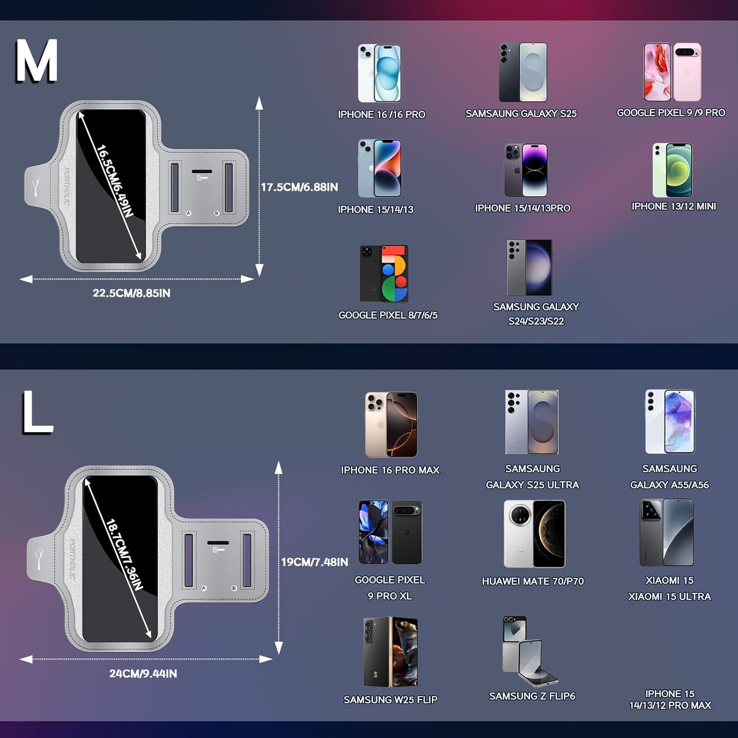 - ăTwo-Size Universal Phone ArmbandăMedium Armband fits phones up to 6.49" screens, including iPhone 12/13/14/15/16 (Pro & standard models), Galaxy S23/S24/S25, and Google Pixel 7/8/9 series (Pro/Standard). Universal stretch design ensures secure fit for most flagship phones.