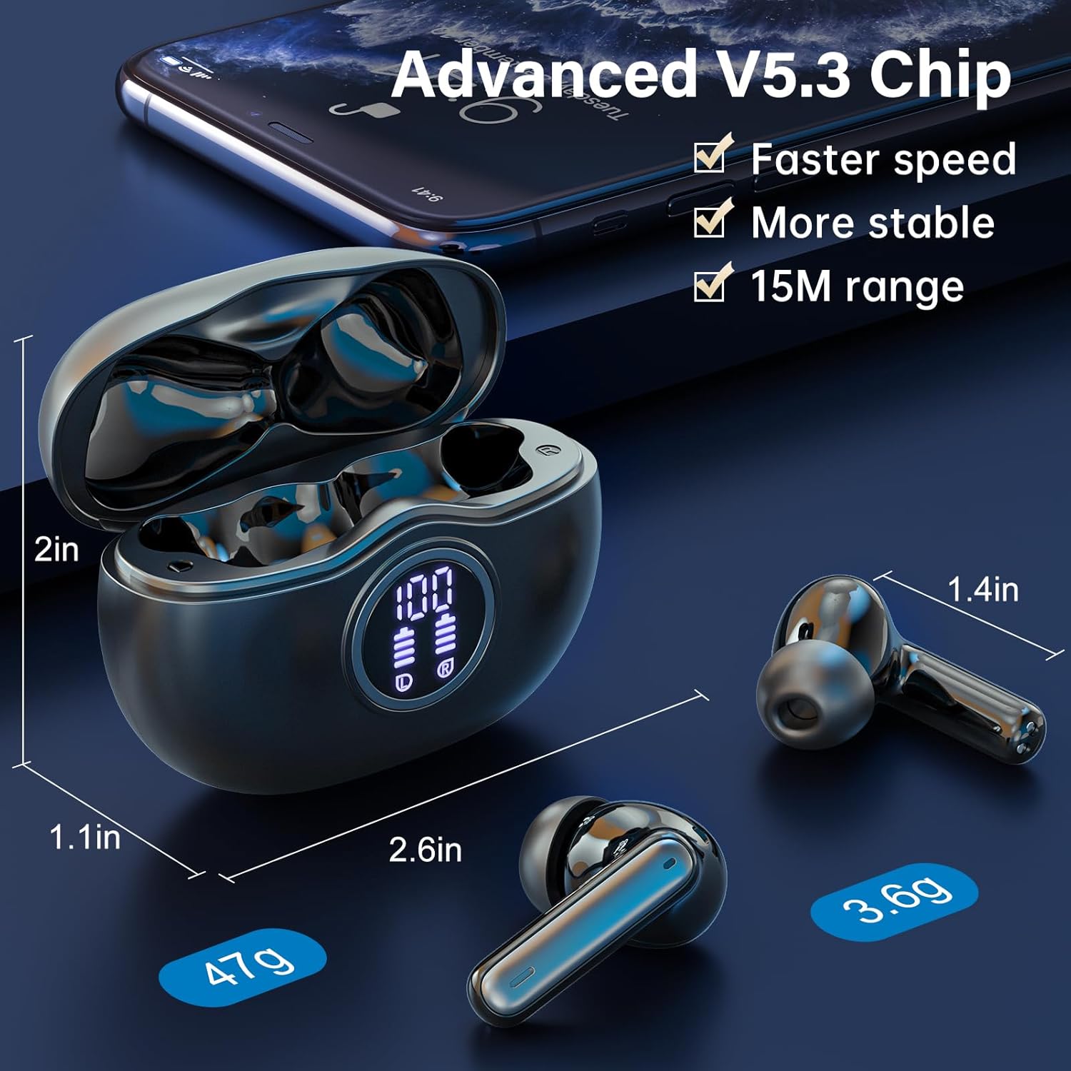 - HiFi Stereo with ENC Noise Cancelling: New 13mm drivers deliver cinema-grade sound under 0.05s latency for gaming/movies. Ear buds wireless bluetooth earbuds signal is much stronger and more stable. There is almost no delay in the gaming/watching videos. Bluetooth 5.3 ensures 98% stable connectivity up to 15m (2x wall penetration vs 5.2), perfect for running or crowded commutes.