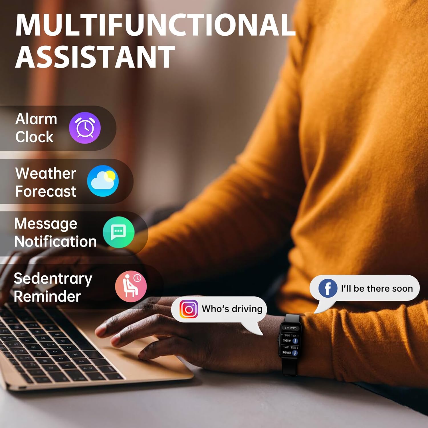 - SMART DAILY FEATURES: Stay connected with call and message alerts, weather updates, music control, breathing exercises, and more. Includes female health tracking, alarms, shutter control, find phone, stopwatch, and sedentary reminders—your all-in-one life assistant.