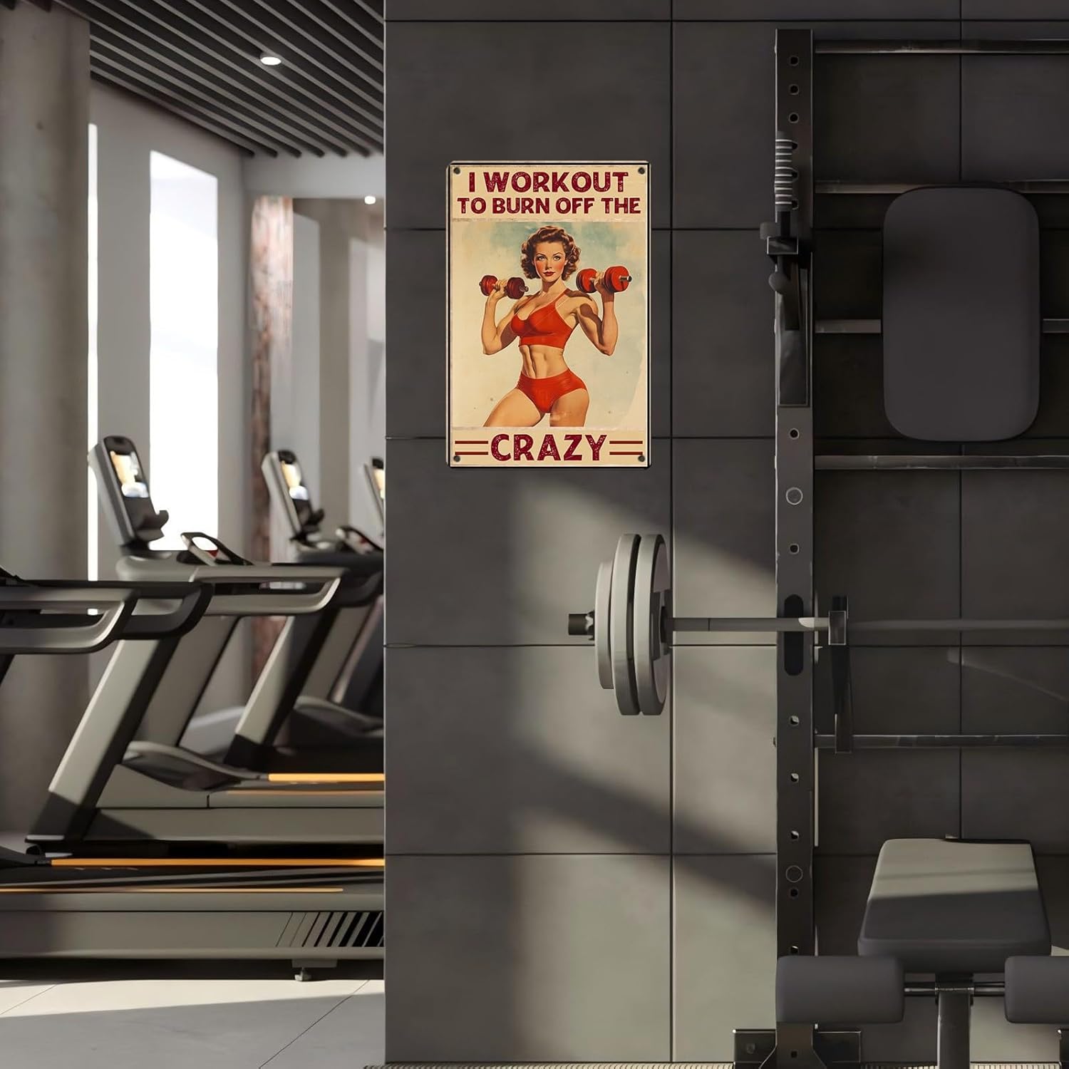 Vintage Girl Gym Tin Sign I Workout to Burn off The Crazy Retro Fitness Wall Decor Nostalgic Art Funny Workout Room Inspirational Metal Poster Store Cafe Pubs Bedroom Bathroom 12 * 8inch
