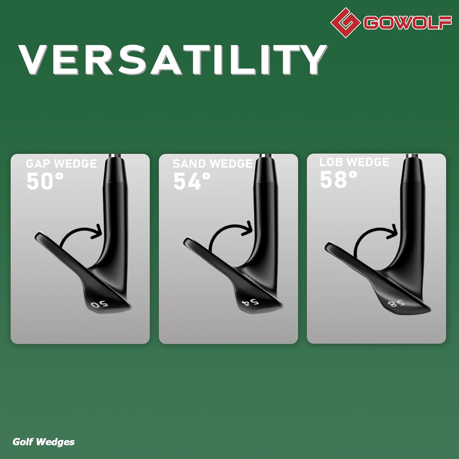 - 【Multi-Loft Single or Wedge Set】Gowolf wedges golf clubs for men and women are available in 50, 52, 54, 56, 58 and 60 degree singles, 50, 54, 58 sets, and 52, 56, 60 sets to meet all your scoring needs on the golf course. Also available in black and chrome, suitable for right hands. Whether you're attacking pins or escaping trouble, this golf wedge set gives you the right tool for every shot.