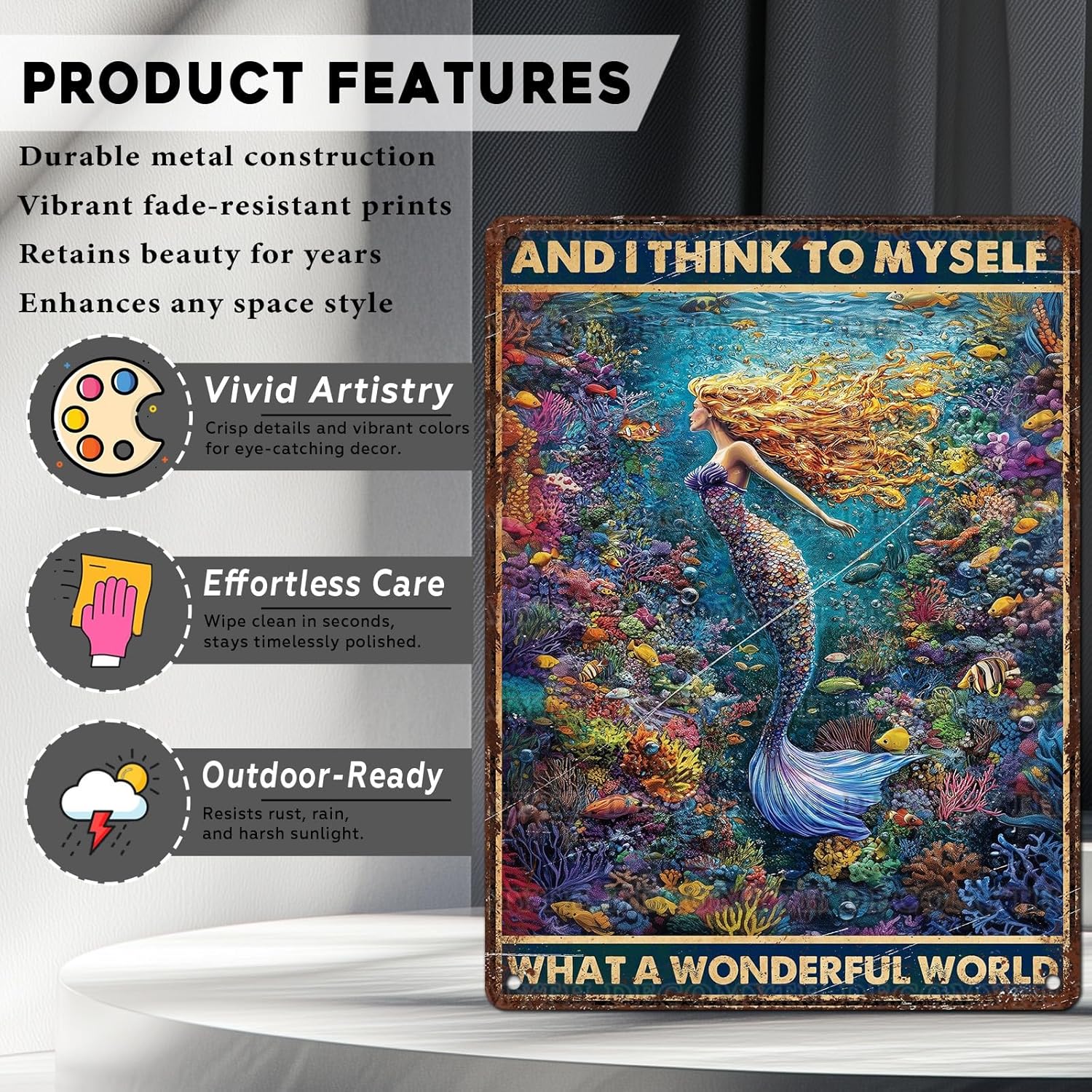Retro Mermaid Tin Sign And I Think to Myself What a Wonderful World Vintage Metal Poster Funny Wall Art Toilet Bathroom Man Cave Bar Cafe Indoor Room Garage 12 * 16inch