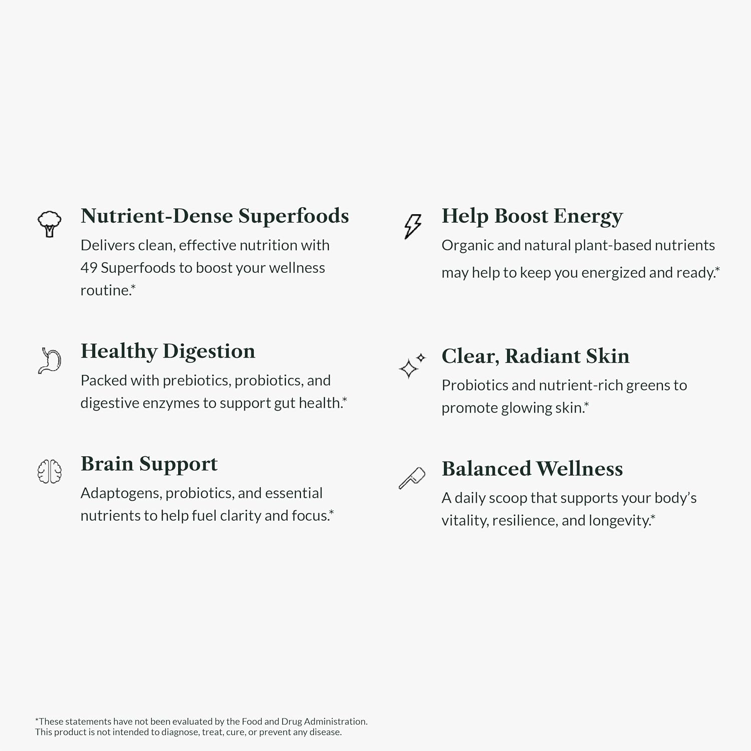 - A Nutrient Rich, Antioxidant Superfood. Greens First Original Greens Powder gives you the benefit of balanced whole nutrition with 49 superfoods, pre and probiotics, folate, and digestive enzymes, in a single daily scoop, to nourish your body and optimize your health.