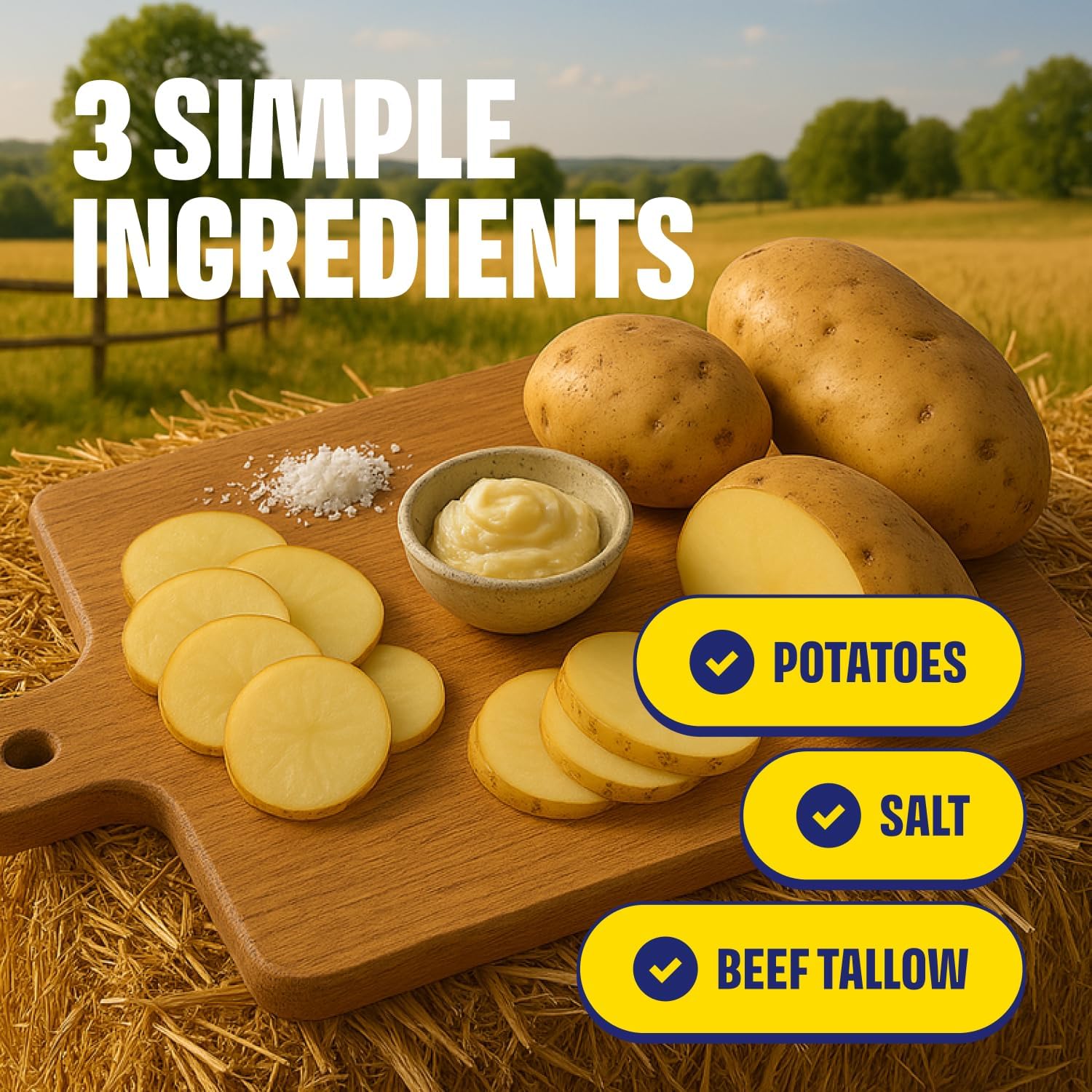 - Simple ingredients, bold crunch: Made with only three ingredients: potatoes, beef tallow, and sea salt. These beef tallow potato chips deliver pure flavor without additives or seed oils. Clean-label tallow chips with craveable crunch in every bite
