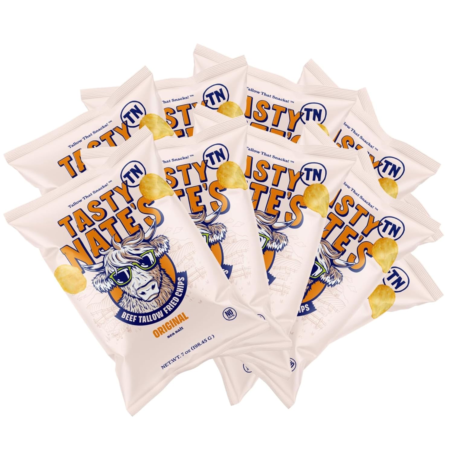 Tasty Nate’s Beef Tallow Potato Chips - Original Sea Salt, Fried in 100% Beef Tallow - Seed Oil Free Chips, Paleo Snacks for Adults, 7oz Bag - Pack of 10