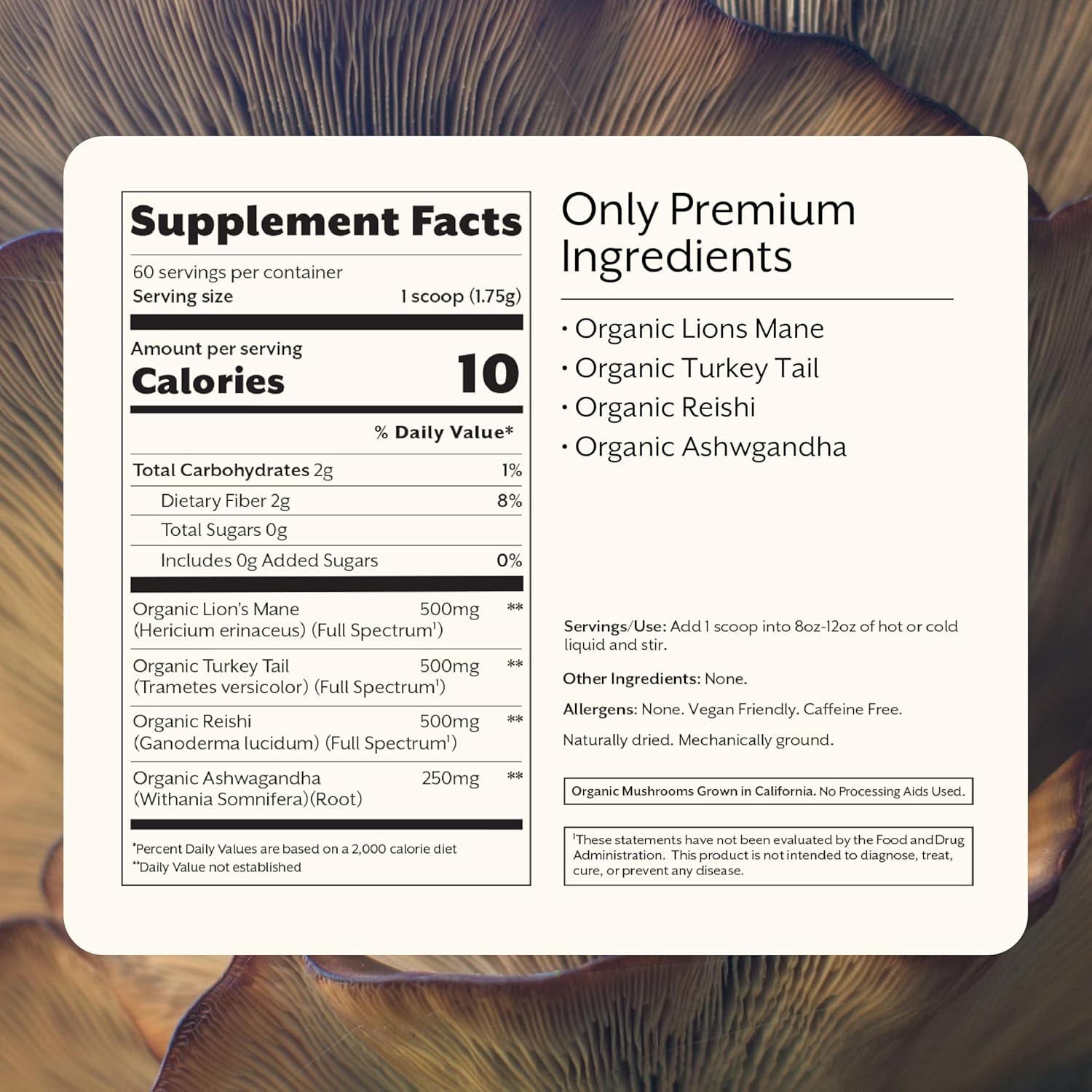 - Ingredient Quality – Organic Mushrooms that are naturally dried, and mechanically ground. Vegan friendly, and caffeine free.