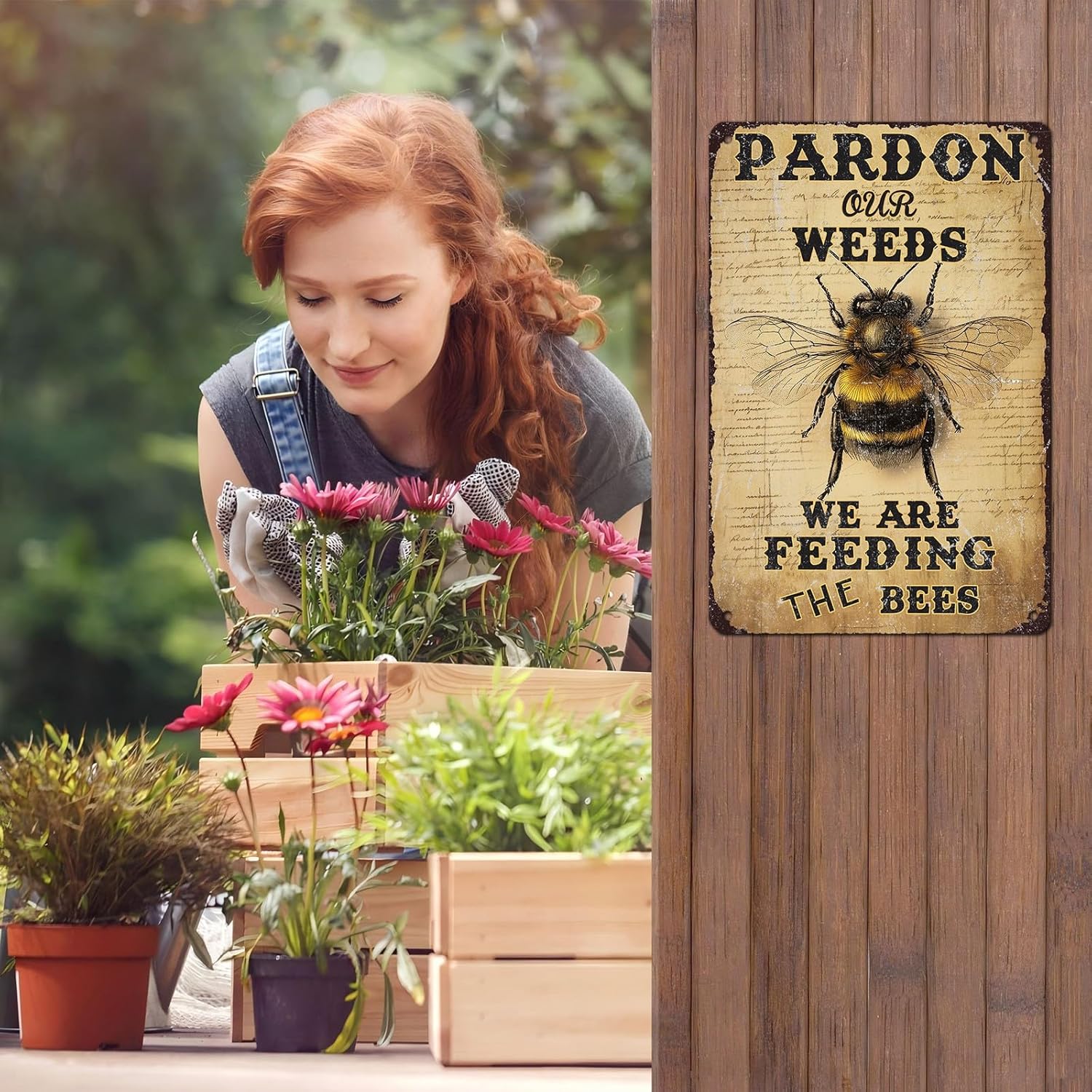 Vintage Bee Tin Sign Pardon Our Weeds We're Feeding The Bees Retro Garden Metal Poster Funny Wall Art Cafe Office Wall Decor for Kitchen Home Bar Plub Club Shop 12 * 8inch