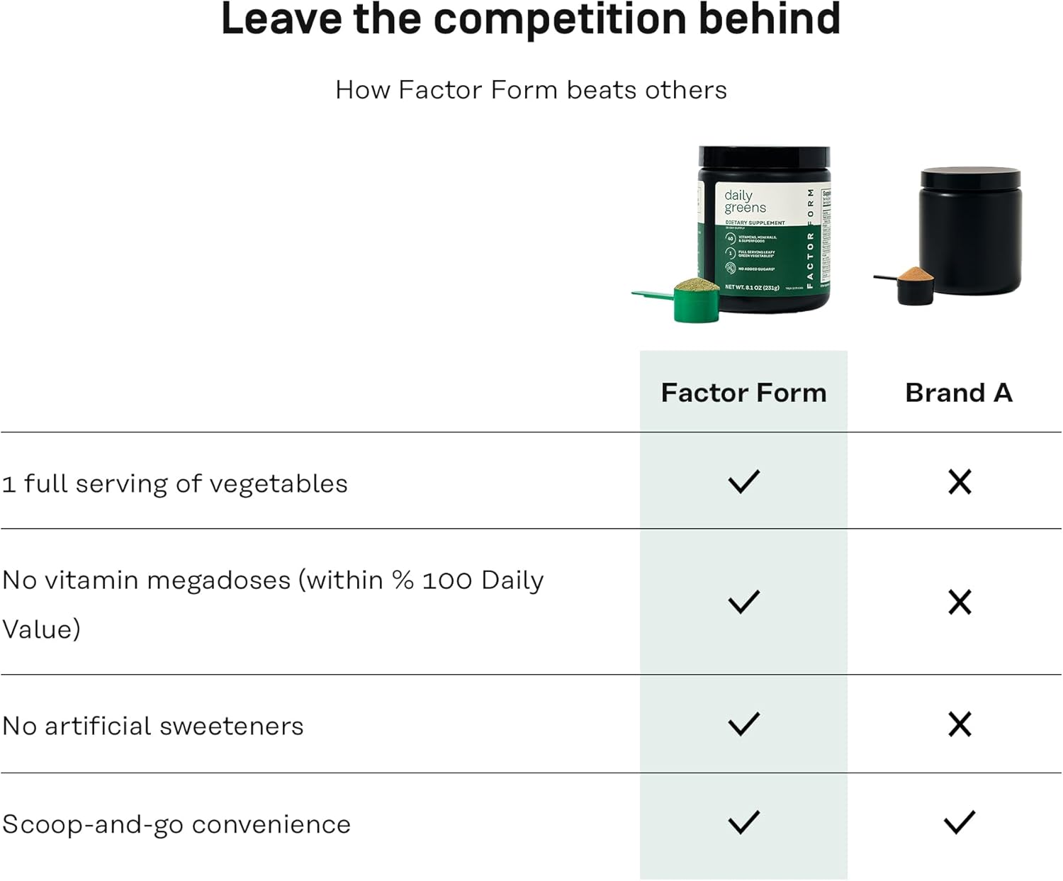 - 40 POWERFUL INGREDIENTS & ONE SERVING OF VEGETABLES FOR DAILY HEALTH – Get your daily dose of greens with Factor Form Daily Greens. Packed with 40 vitamins, minerals, and superfoods, including a full serving of leafy greens, prebiotics, probiotics, antioxidants, and functional adaptogens. This one-step daily formula makes it easy to help fill nutrient gaps and support overall wellness.
