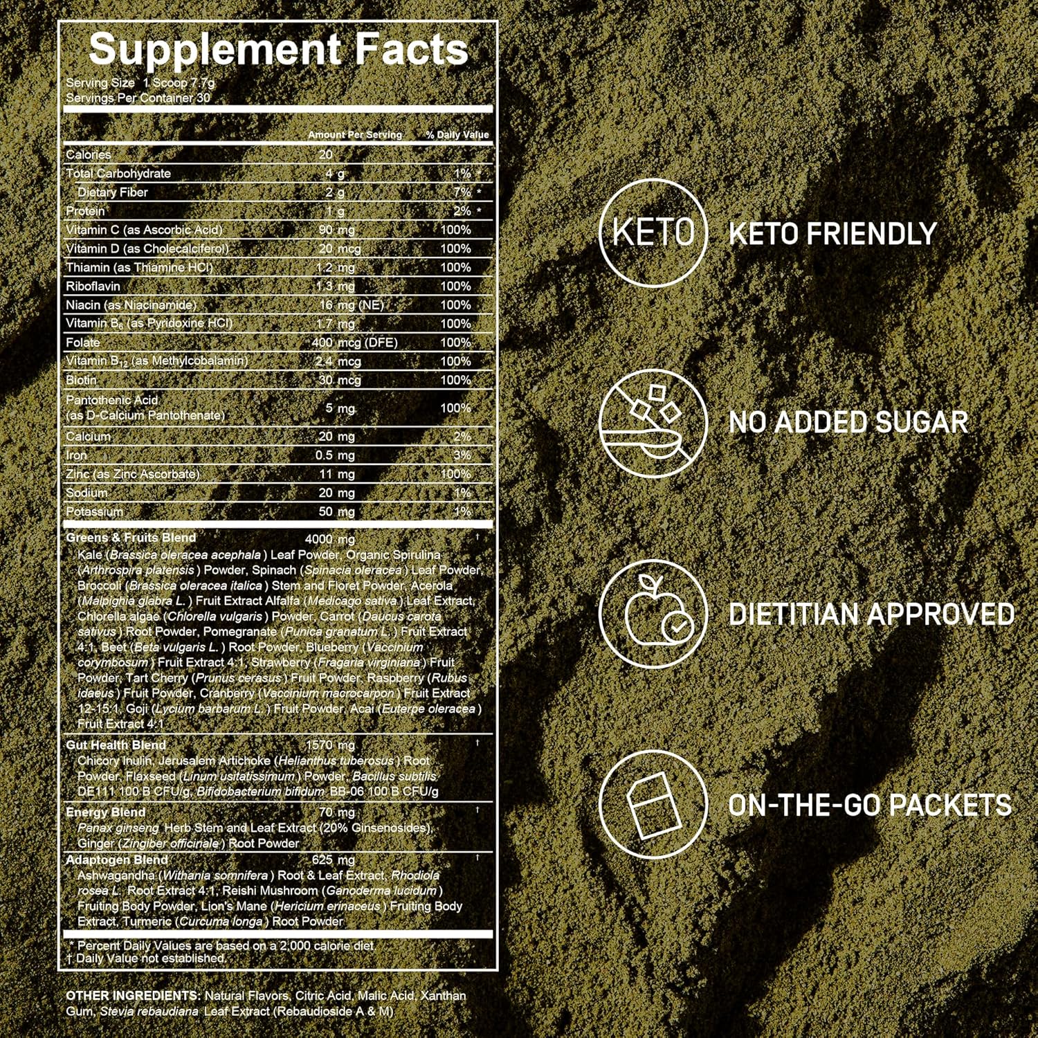 - SUPPORTS GUT HEALTH, ENERGY & IMMUNITY – Daily Greens is formulated to support digestive health, cognitive function, a healthy immune system, and everyday stress reduction. With clinically substantiated ingredients like probiotics, ashwagandha, ginseng, and vitamin C, this superfood blend helps you feel your best every day. Plus, it's keto-friendly, plant-based, with no added sugar—designed for all lifestyles.