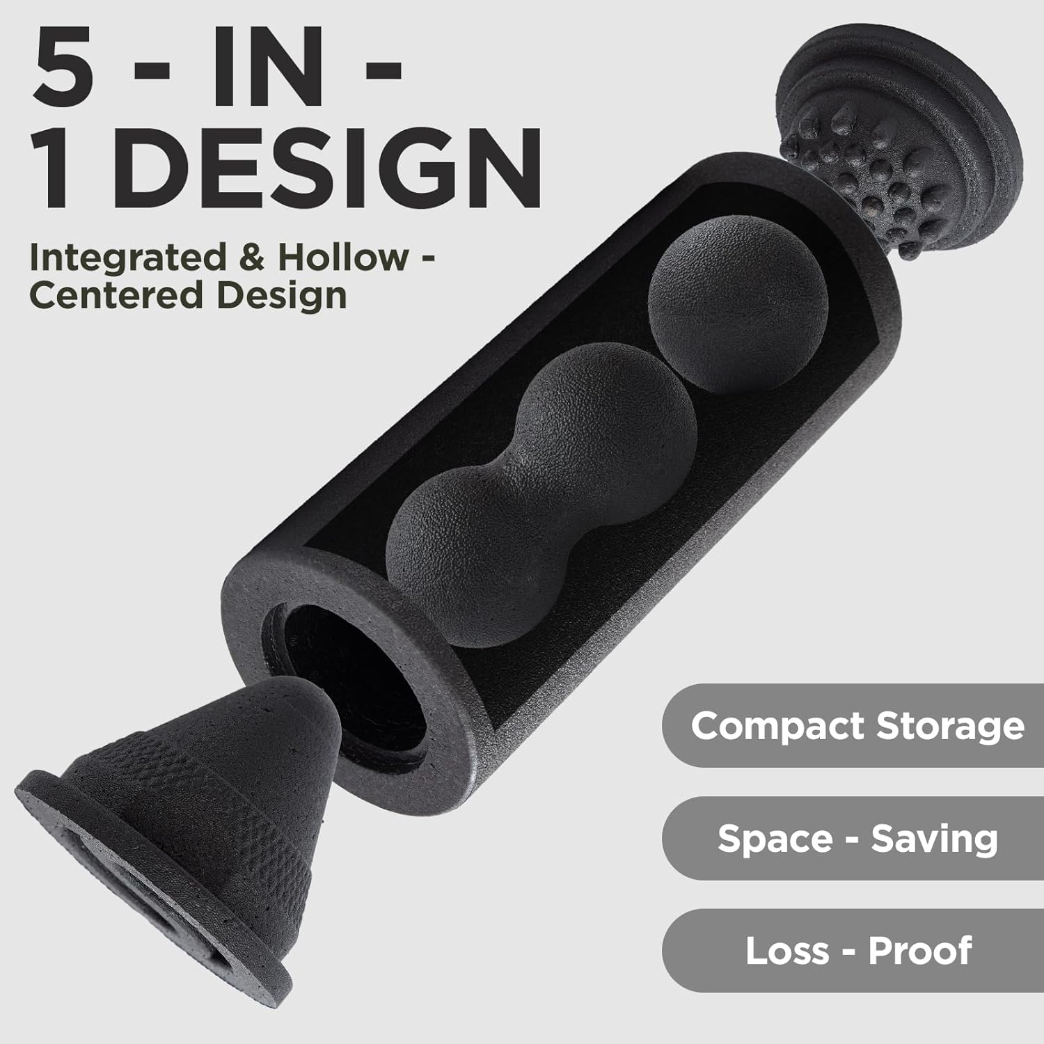 - 🌀 ​Hollow Design Integration System- Features an innovative ​hollow-core yoga roller​ that stores the ​peanut massage ball​ and ​fascia ball, securely sealed with the ​curved muscle brush​ and ​triangle massage cone. Assembled, it matches the size of a standard foam roller (14.5 inches) for seamless storage, while instantly transforming into ​5 specialized tools​ when disassembled.