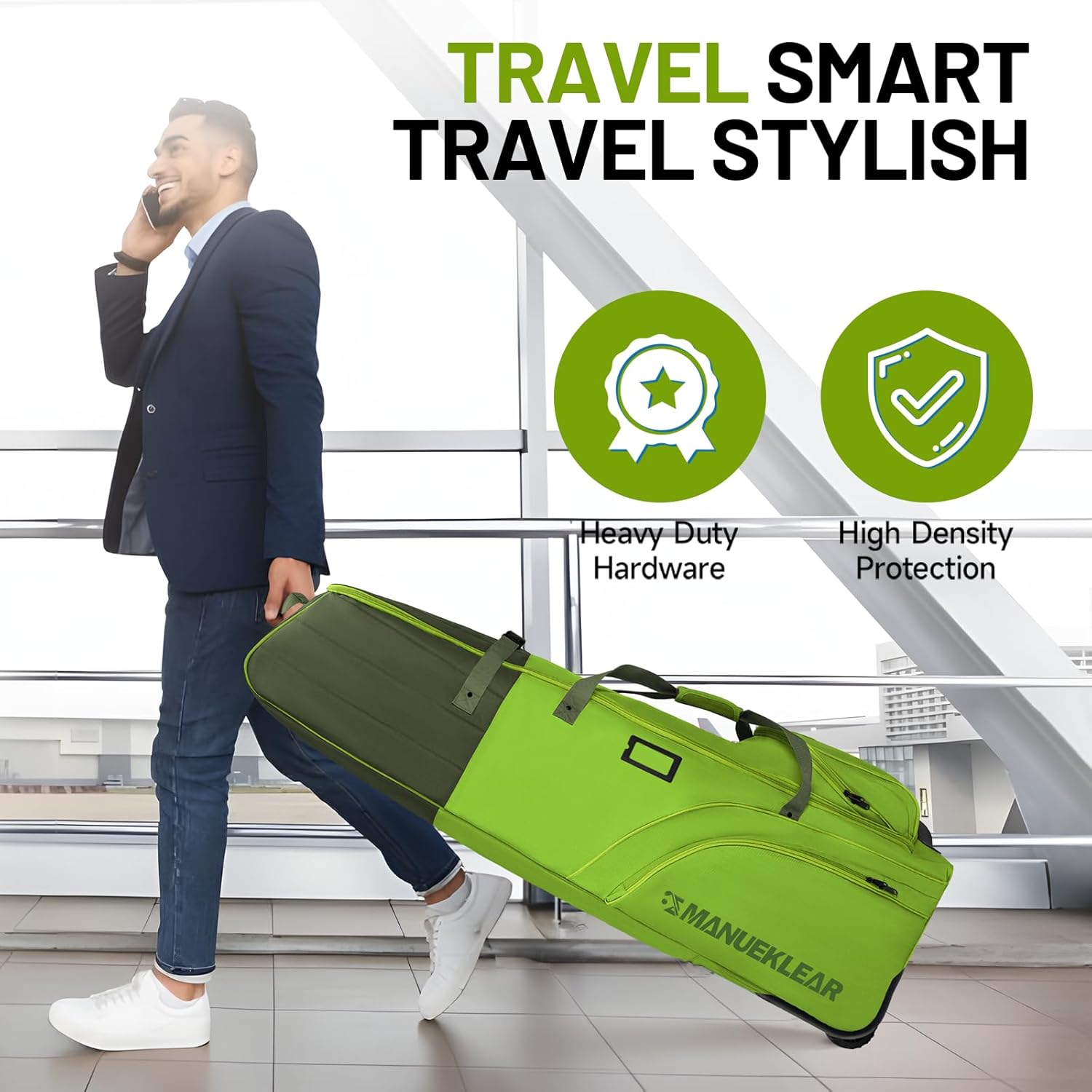 - 🚀 𝐄𝐟𝐟𝐨𝐫𝐭𝐥𝐞𝐬𝐬 𝐓𝐫𝐚𝐯𝐞𝐥 𝐨𝐧 𝐀𝐧𝐲 𝐓𝐞𝐫𝐫𝐚𝐢𝐧: The MANUEKLEAR golf travel bag is engineered for smooth and stable movement on any terrain. Featuring robust, silent-rolling wheels, it glides effortlessly through airports and navigates rough paths with ease. Reinforced handles provide additional support, making lifting and carrying simple and strain-free. Whether you're in busy terminals or loading it into your vehicle, this bag ensures a worry-free travel experience every time.