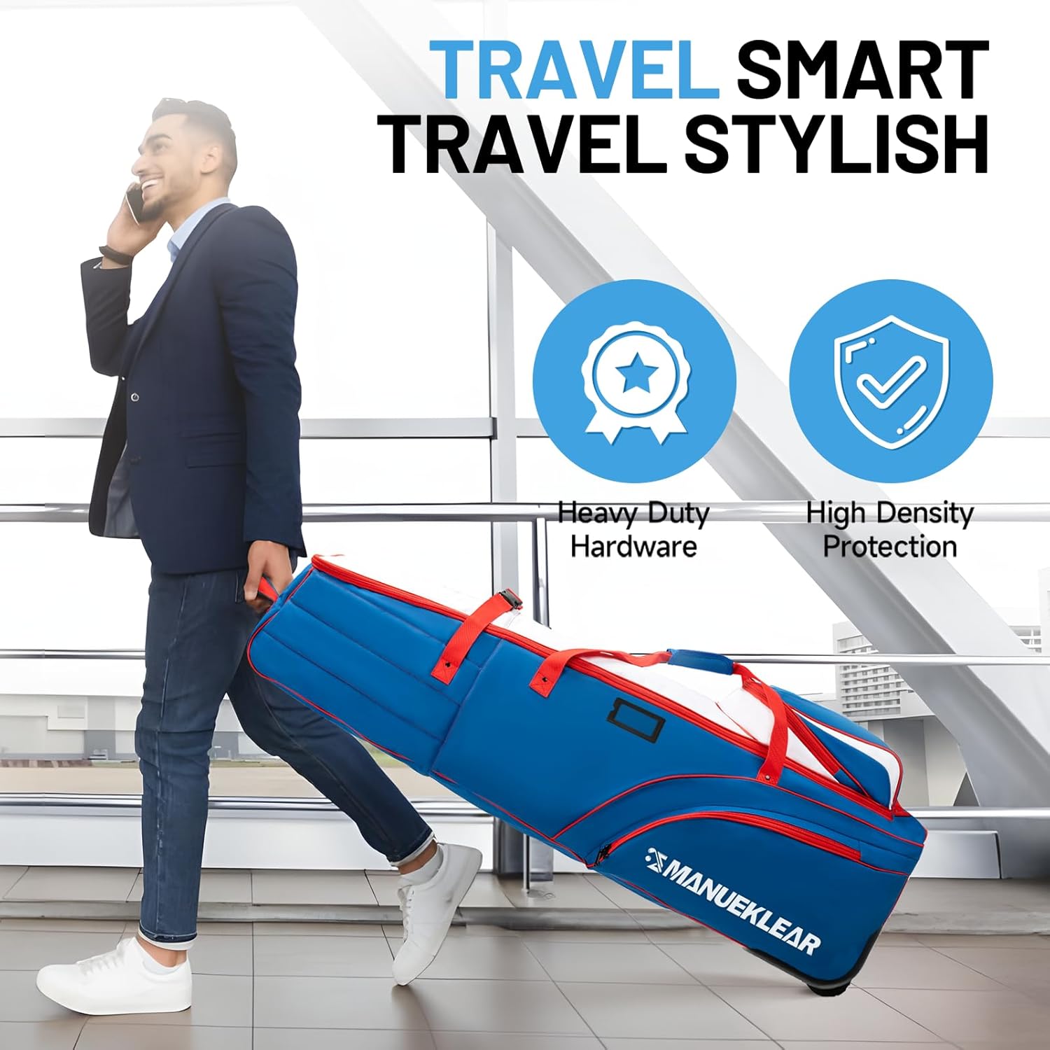 - 🚀 𝐄𝐟𝐟𝐨𝐫𝐭𝐥𝐞𝐬𝐬 𝐓𝐫𝐚𝐯𝐞𝐥 𝐨𝐧 𝐀𝐧𝐲 𝐓𝐞𝐫𝐫𝐚𝐢𝐧: The MANUEKLEAR golf travel bag is engineered for smooth and stable movement on any terrain. Featuring robust, silent-rolling wheels, it glides effortlessly through airports and navigates rough paths with ease. Reinforced handles provide additional support, making lifting and carrying simple and strain-free. Whether you're in busy terminals or loading it into your vehicle, this bag ensures a worry-free travel experience every time.