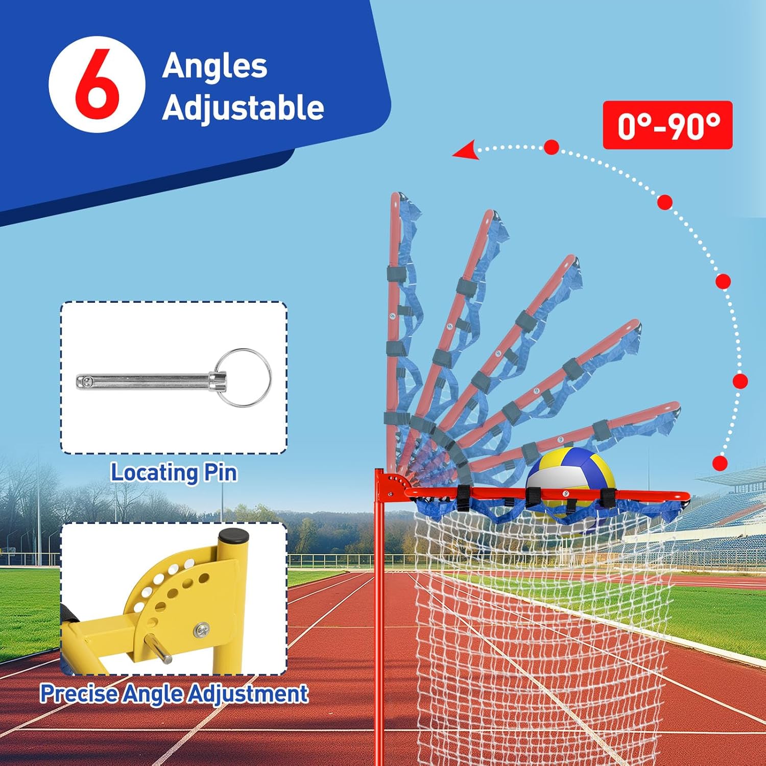 - 6 Adjustable Angles:The top pole of the volleyball setting training net has 6 precise holes corresponding to different angles.The basket can be easily adjusted between 0-90°for players of different skill levels and training goals.Basket size:22x22inch.The adjustable angle volleyball trainer equipment is ideal for practicing volleyball setting and passing.