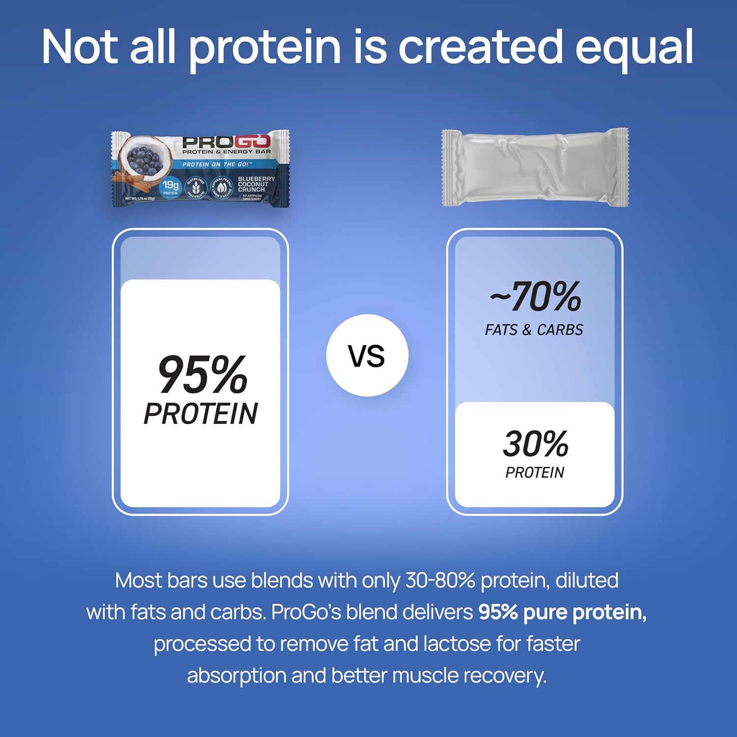 - Clean, 19g High Protein Snacks: ProGo’s 95% pure protein isolate blend powers these energy bars with superior efficiency for muscle growth and repair compared to blends with only 30-80% protein content.
