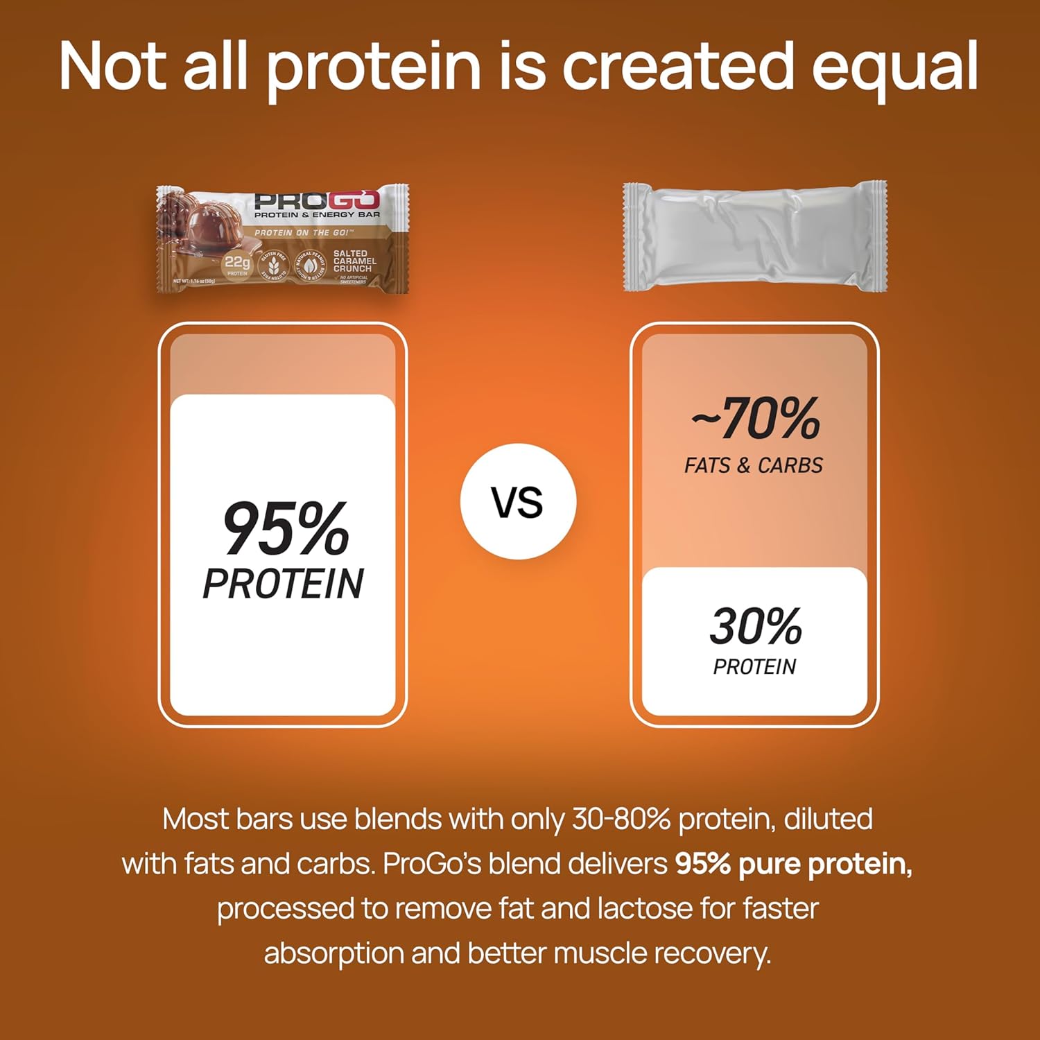 - Clean, 22g High Protein Snacks: ProGo’s 95% pure protein isolate blend powers these energy bars with superior efficiency for muscle growth and repair compared to blends with only 30-80% protein content.