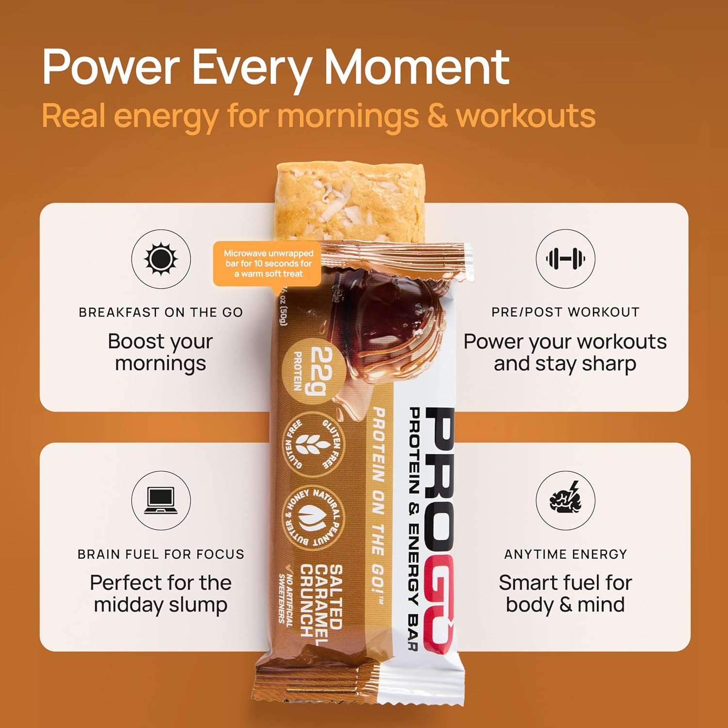 ProGo Protein Bars, Low Sugar, High Protein Snacks (22g) - 95% Pure Isolate for Faster Muscle Growth & Recovery, Low Calorie, Sweetened w/Peanut Butter & Honey (20-Count, Salted Caramel Crunch)