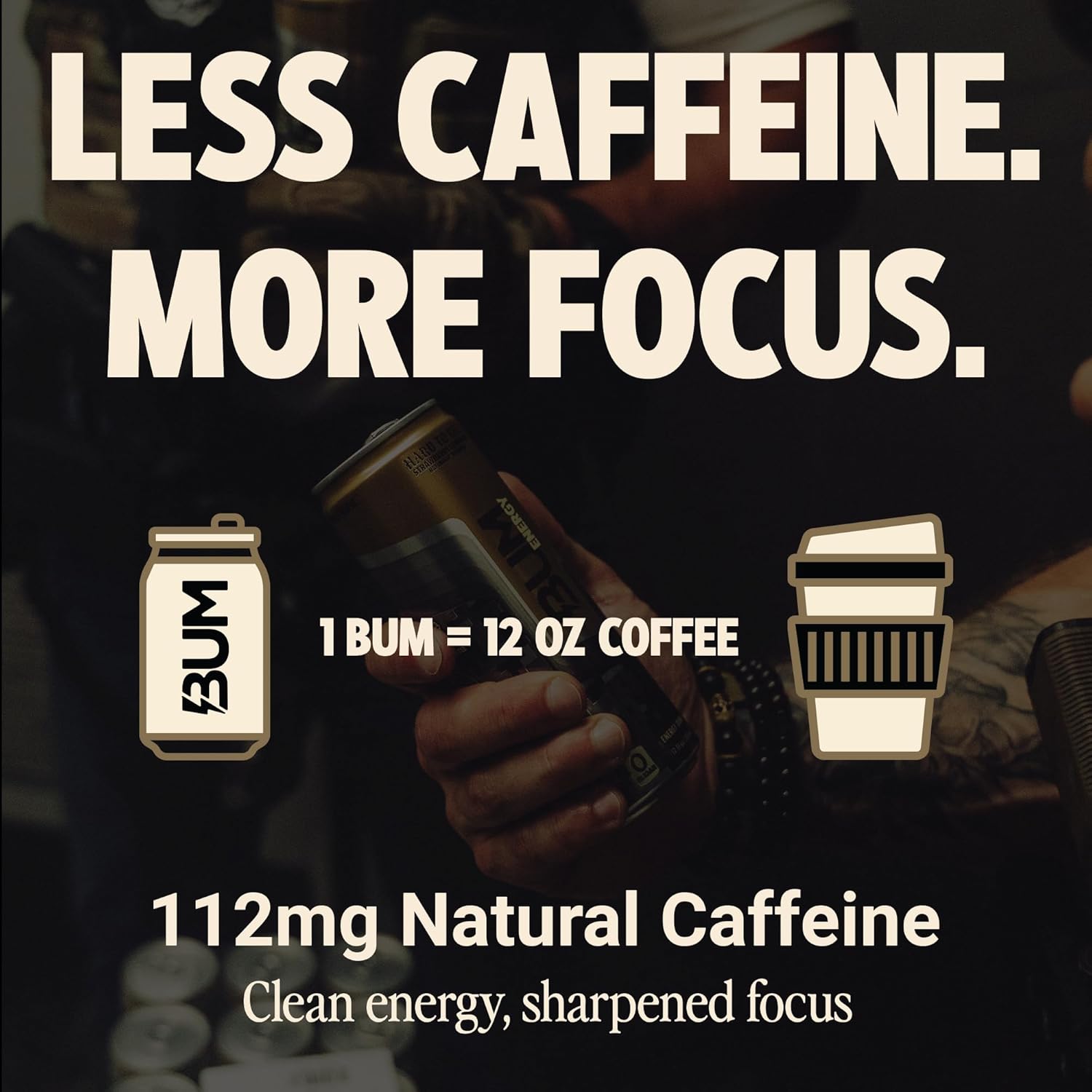 - Keep It Clean: Leave the drinks that contain a laundry list of ingredients in the past. Bum Energy contains just two simple ingredients, 112mg of Natural Caffeine & 250mg of Cognizin. Cognizin helps you dial in your focus while Caffeine stimulates your mind to keep you moving forward. Made with zero sugar and no artificial colors, every sip unlocks pure, untapped potential.