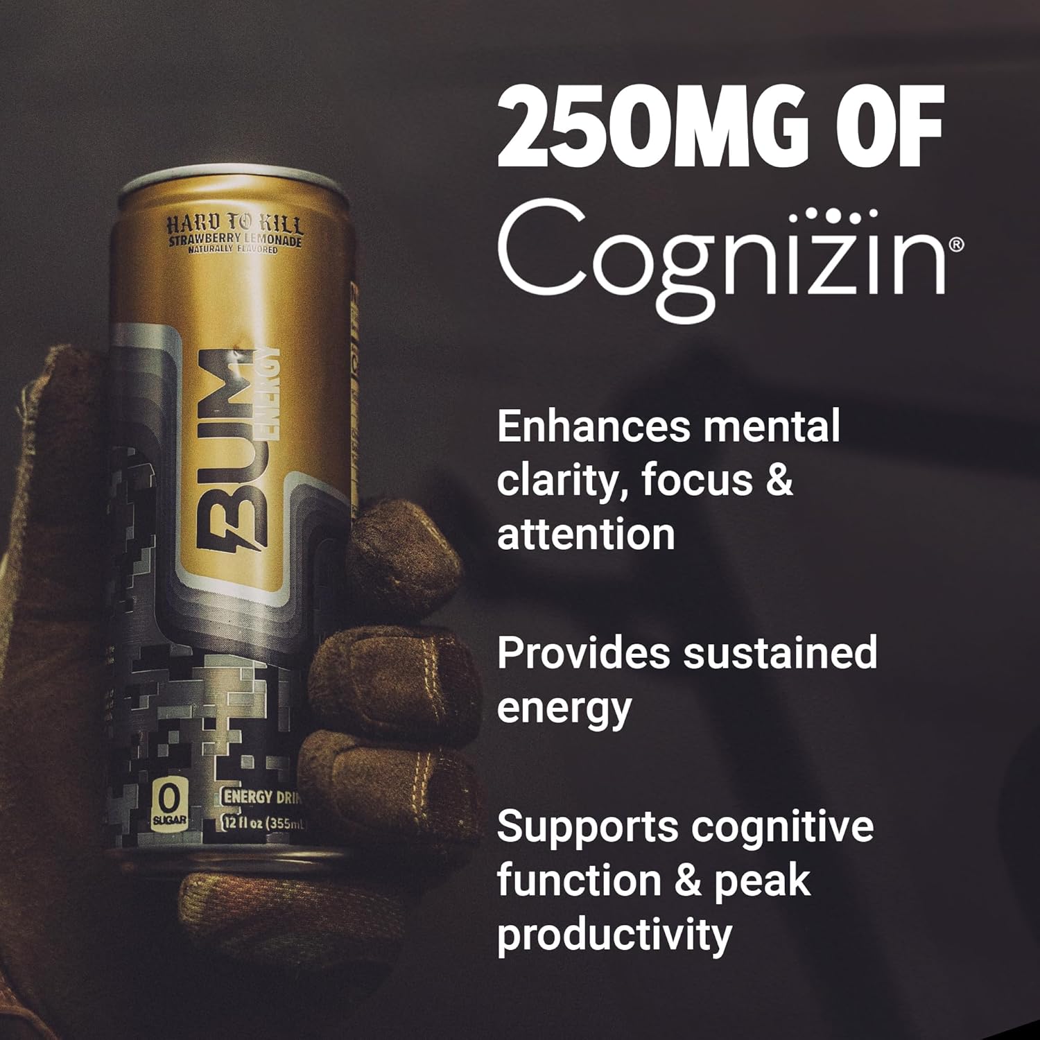 BUM Sugar-Free Energy Drink, Strawberry Lemonade - Lightly Carbonated & No Artificial Colors, Natural Caffeine & Citicoline for Energy, Focus, Brain Boost & Workout Sports Beverage - 12 oz, Pack of 12