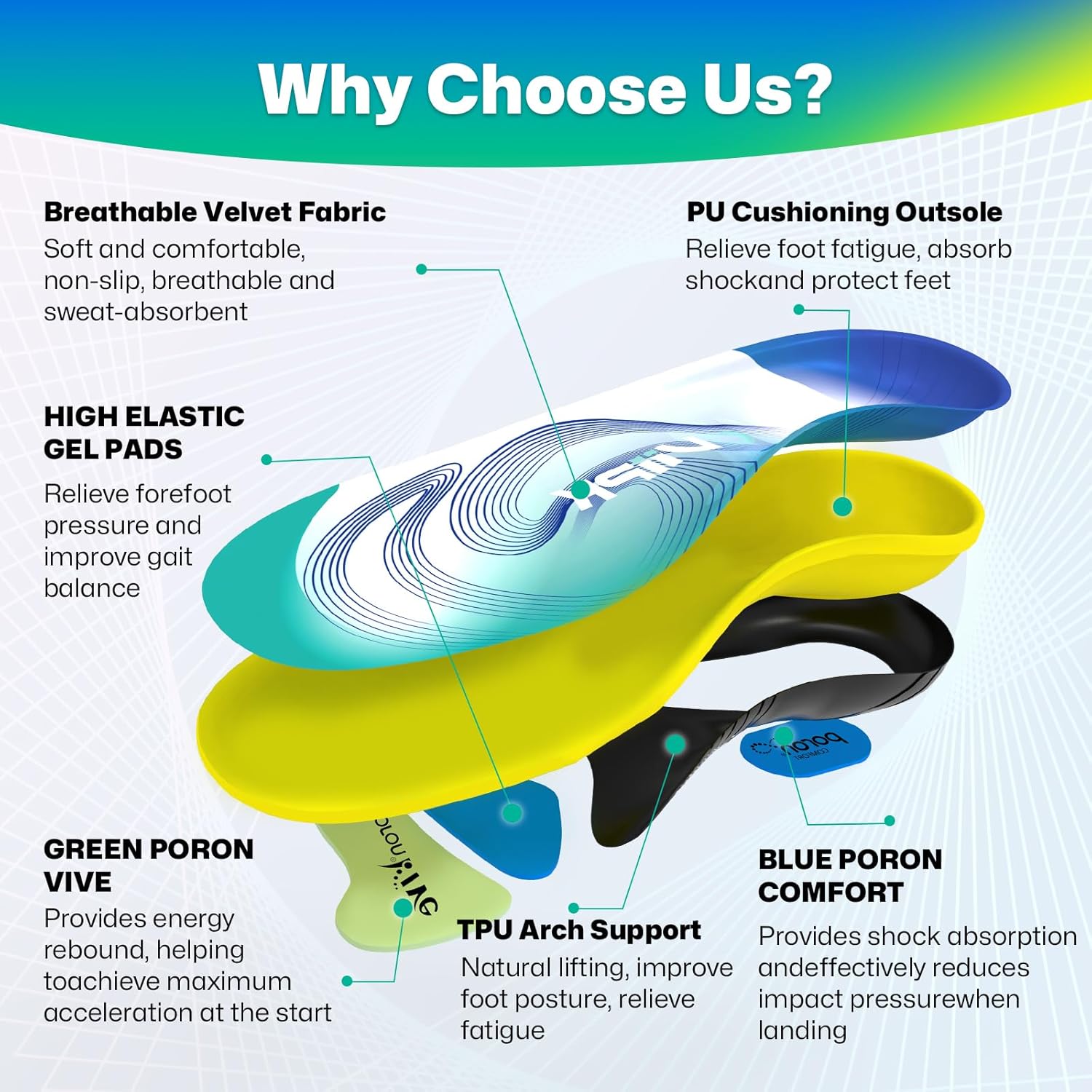 - Upgraded Triple Cushioning Shock Absorption: Our shoe insoles for men women are made of high-quality American PORON padding: blue PORON COMFORT provides cushioning and shock absorption, and green PORON VIVE provides high resilience. And it is additionally equipped with a high-elastic gel pad to provide additional cushioning and shock absorption for the forefoot. Bring you a comfortable experience