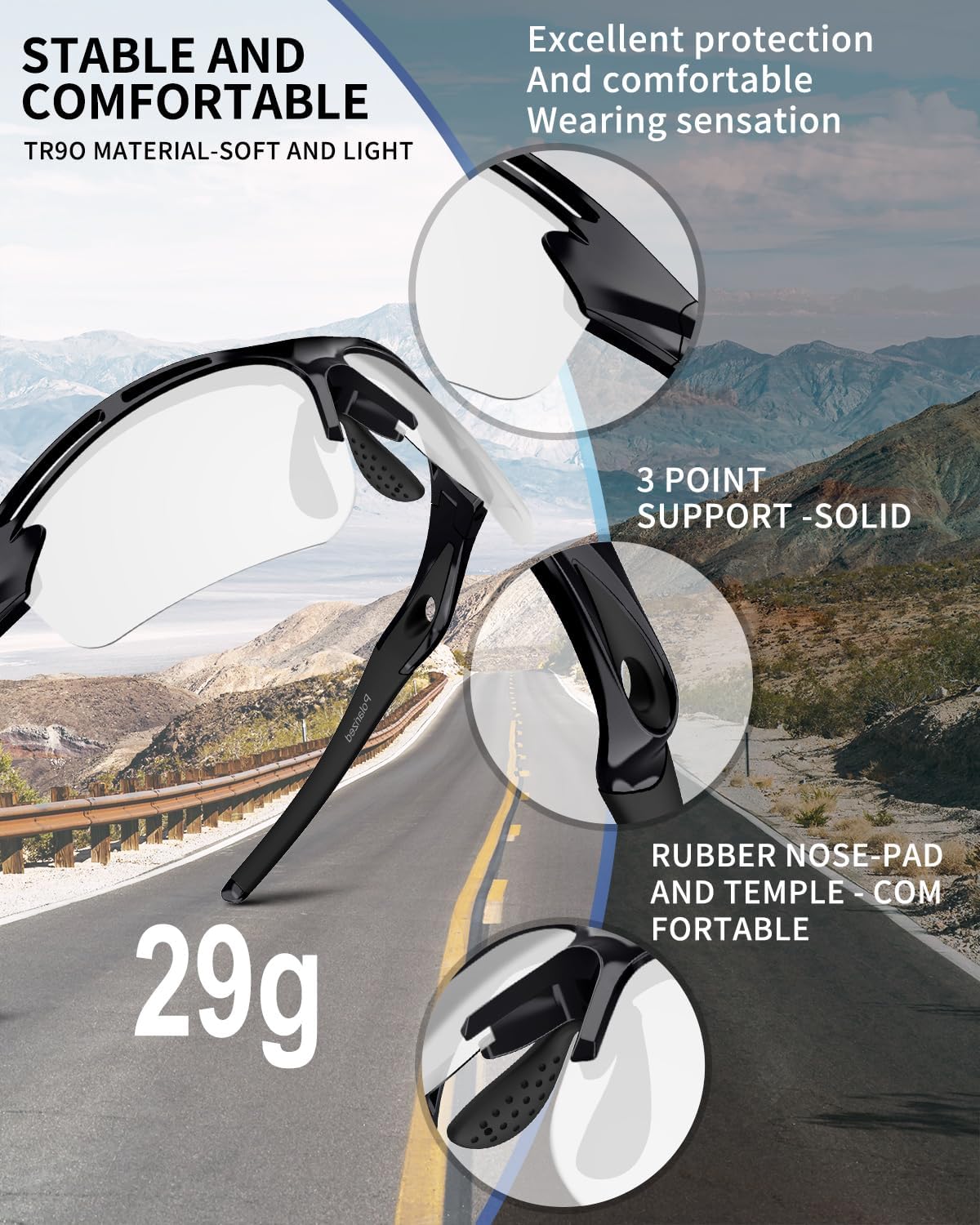 - [PC HD Photochromic Lenses]:Precision-engineered to dynamically adjust tint depth based on ambient UV intensity, these lenses transition from crystal clear (85% light transmission) to a maximum dark gray tint (15% light transmission). This real-time response precisely modulates incoming light, consistently delivering optimal visual comfort and protection across sunlight conditions – from mild to intense exposure.
