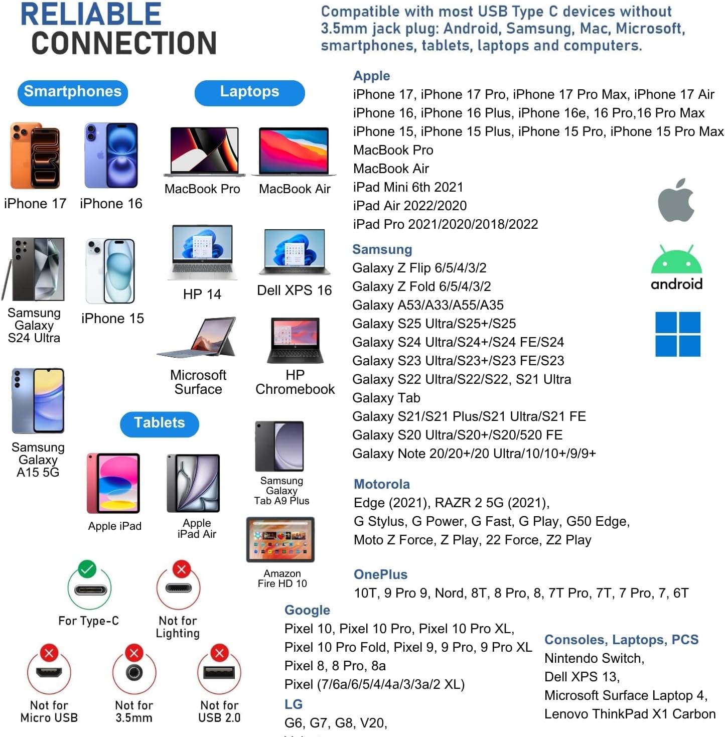 - SAMSUNG: Galaxy S24/S23/S22/S21/S21+/S21 Ultra/S21/S21 Ultra/S21 FE/S20/ Galaxy Tab S8/S7/S6/S5e, A53/A54/A55/A33/A34/A35 Galaxy Z Flip 6/5/4/3/2 Fold 6/5/4/3/2 - GOOGLE Pixel 10/Pro/XL/Fold, Pixel 9/Pro/XL, 8/Pro/8a, 7/6a/6 PRO/6/5/4/4a β MOTOROLA Edge 2021 β LAPTOPS: DELL XPS 13, MICROSOFT Surface Laptop 4. And more devices without a 3.5mm jack port. We provide a 5-year warranty and our customer support is here to answer questions 24/7