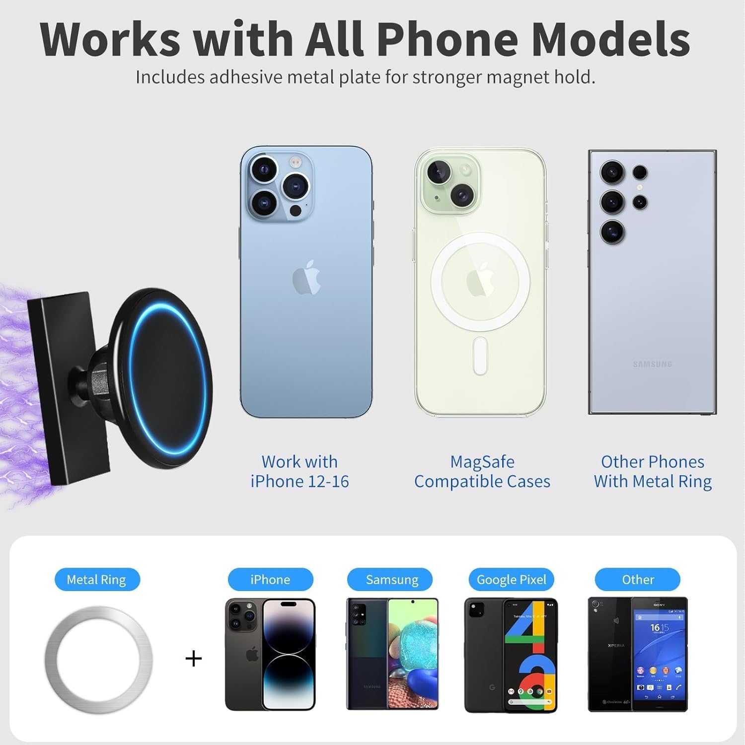 - Universal Compatible: Magnetic golf cart phone holder works with ALL PHONES. It’s fully compatible with iPhone16-12 series—just snap them on directly.(Note: Comes with adhesive sheet metal to boost magnetic strength.) And also work with all other phones, simply use the included adhesive sheet metal to enhance magnetic strength for use with the magnetic phone holder