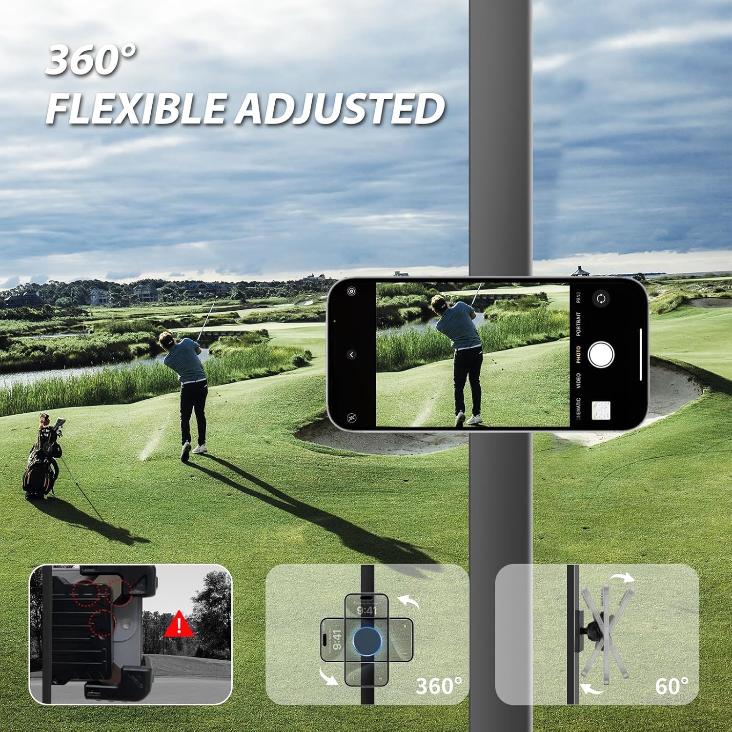 - All-Metal Construction: Made of premium aluminum alloy, this magnetic golf cart phone mount is built to last, offering superior durability and resistance to drops. Effortlessly adjust your phone with 360° rotation for the best angle while driving. No camera obstruction, so you can easy to capture every swing on the golf course