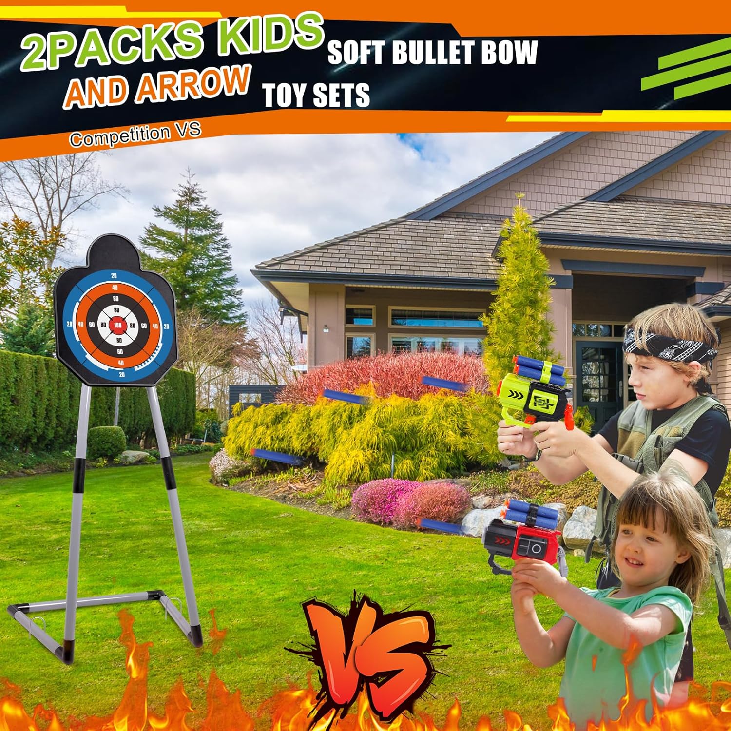 - 【Upgrade LED Lighting Kids Bow and Arrow Toys】The bow and arrow toy set is compatible with 2 play modes. This set features bows, arrows, and foam darts shooting toy guns. Ideal for 2-3 players, there are different scoring areas on the standing target. Kids can aim and hit the targets to score points, let the children experience the fun of competing with each other. LED lights bow allows little archers to aim more accurately and play day and night.