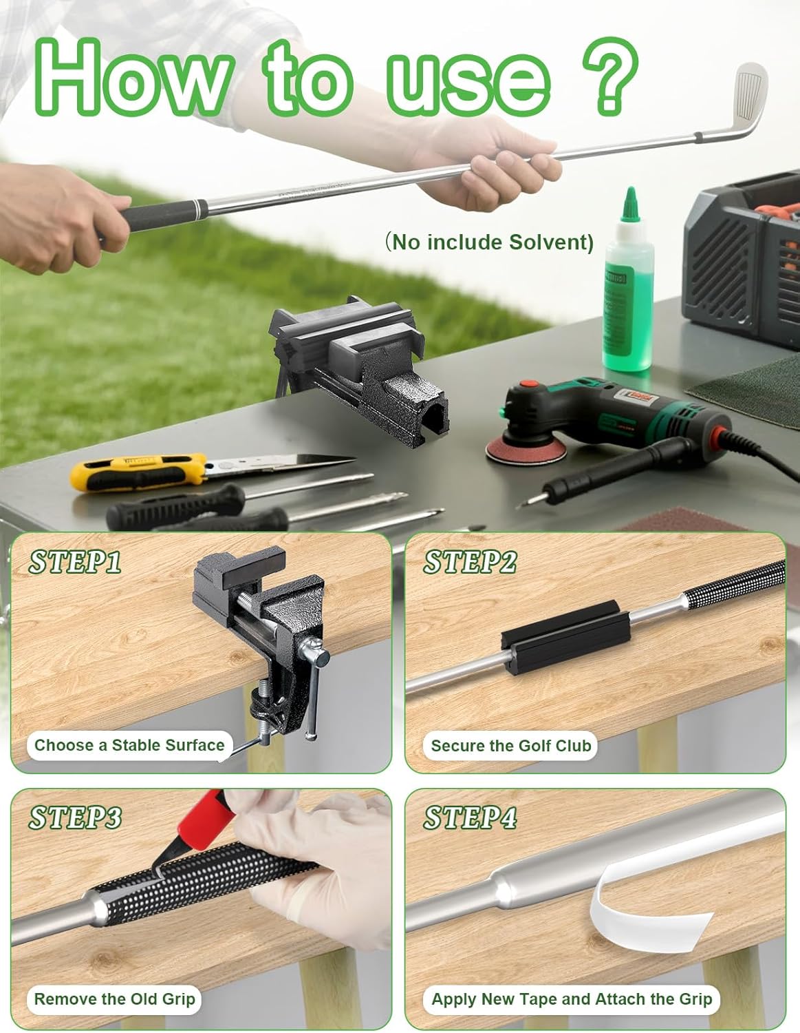 - Multi-Functional Tool Kit - Golf club grip vise clamp kit includes, a portable table vise to hold clubs steady, a sharp retractable safety hook knife for effortless grip removal, a protective rubber sleeve to safeguard your clubs, a pair of gloves and 15 extra-long adhesive strips (2"x10") to meet your golf club maintenance needs (No include solvent)