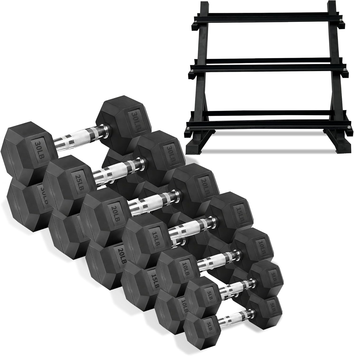 Ritafer 6-10 Pair Hex Rubber Dumbbell Set 350/450 and 550 lbs(5-50 lbs )Hand Free Weight for Strength Coated Encased Iron Weights with Dumbbells Storage Rack Home Gym
