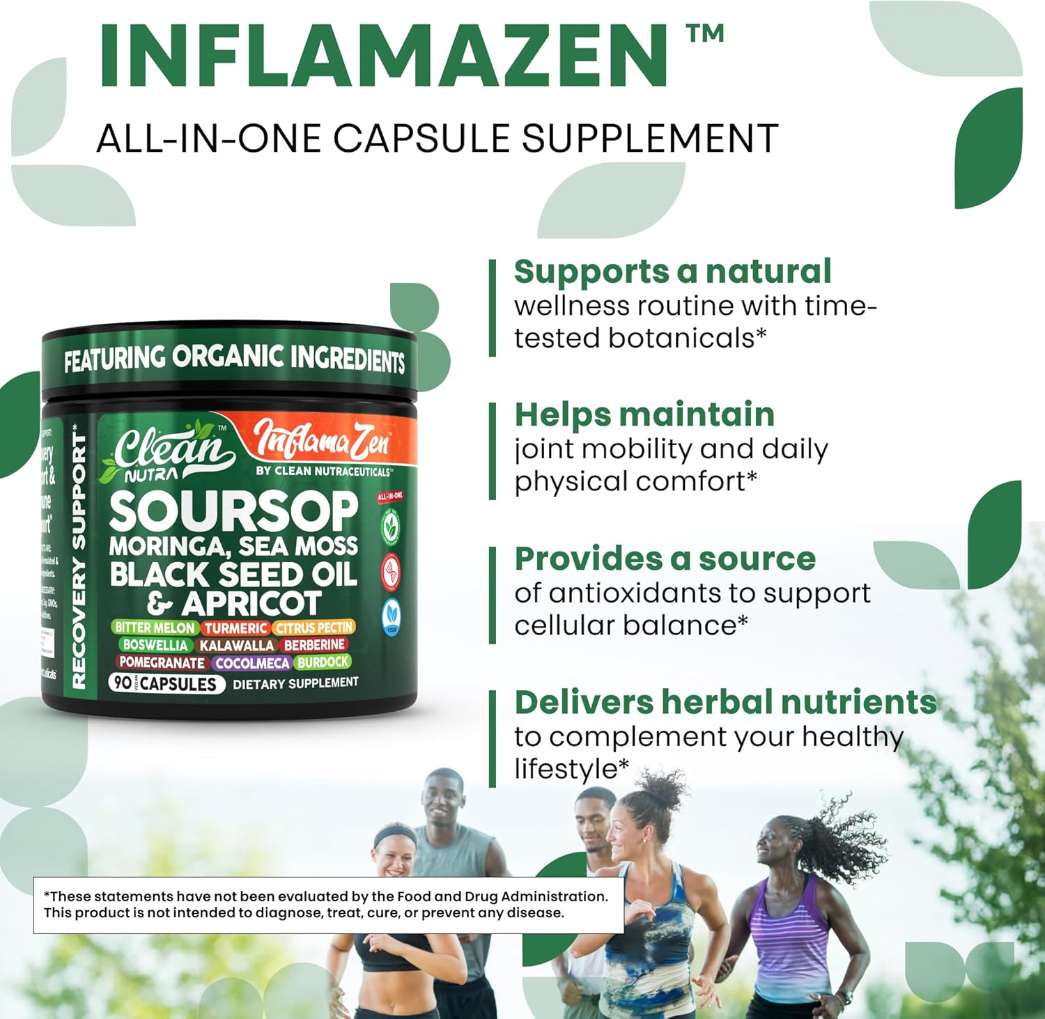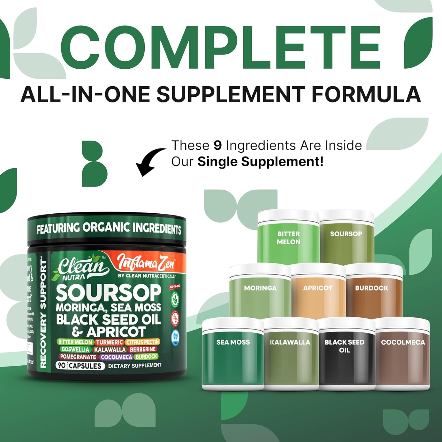 Clean Nutra Soursop Supplement Moringa Sea Moss Black Seed Oil Berberine Turmeric Resveratrol Quercetin Greens Bitters Boswellia Bitter Melon Burdock Root Antioxidant Support 90 Capsules