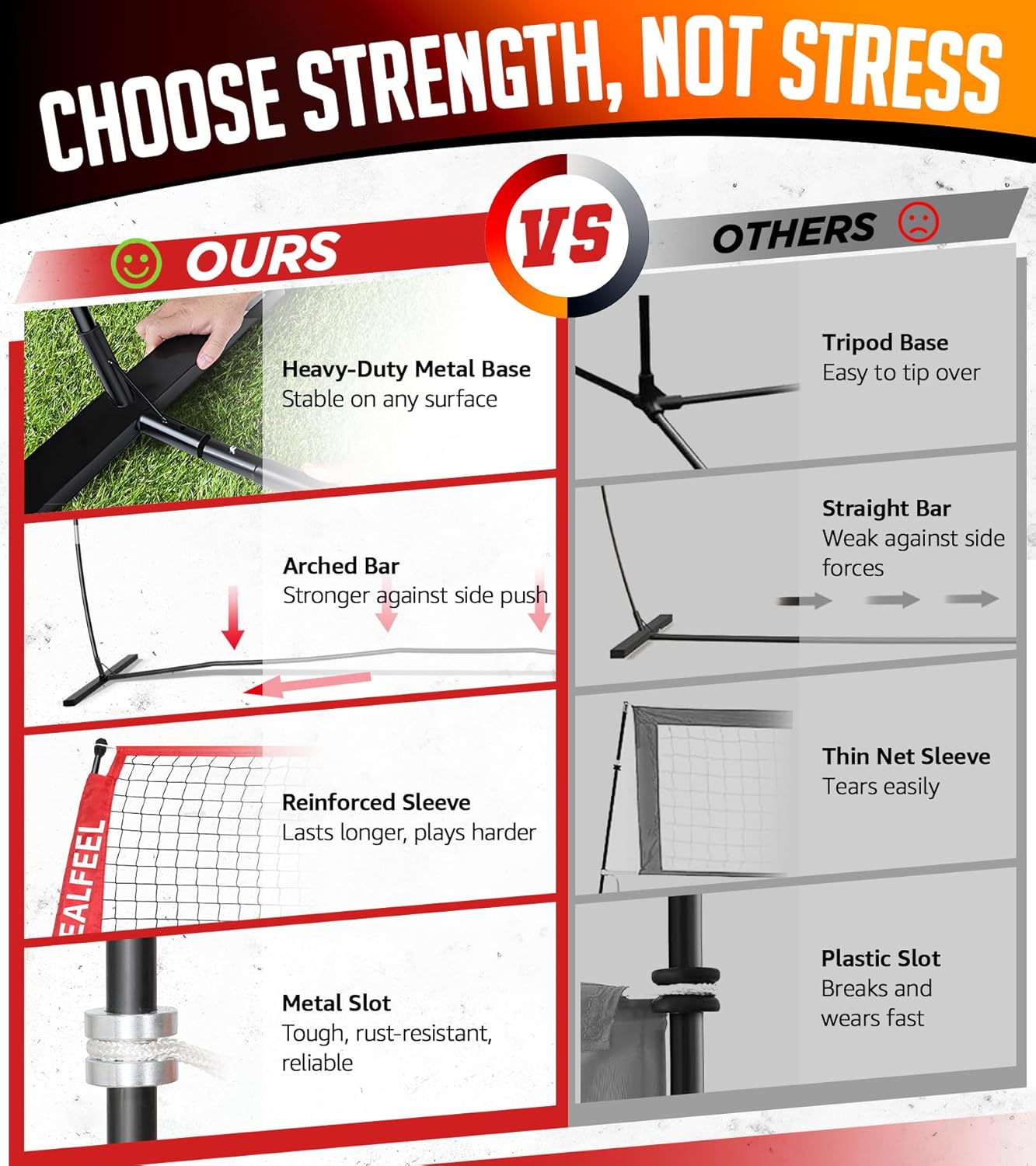 - UPGRADED 16MM FIBERGLASS POLES WITH POLETECH TECHNOLOGY: Our volleyball training net is equipped with upgraded, patented Poletech fiberglass poles, designed by professional athletes to ensure durability for over 200,000 uses. The volleyball net with poles effectively absorbs and disperses impact, preventing warping or breakage during high-intensity training. This enhances safety and extends the overall lifespan of the equipment
