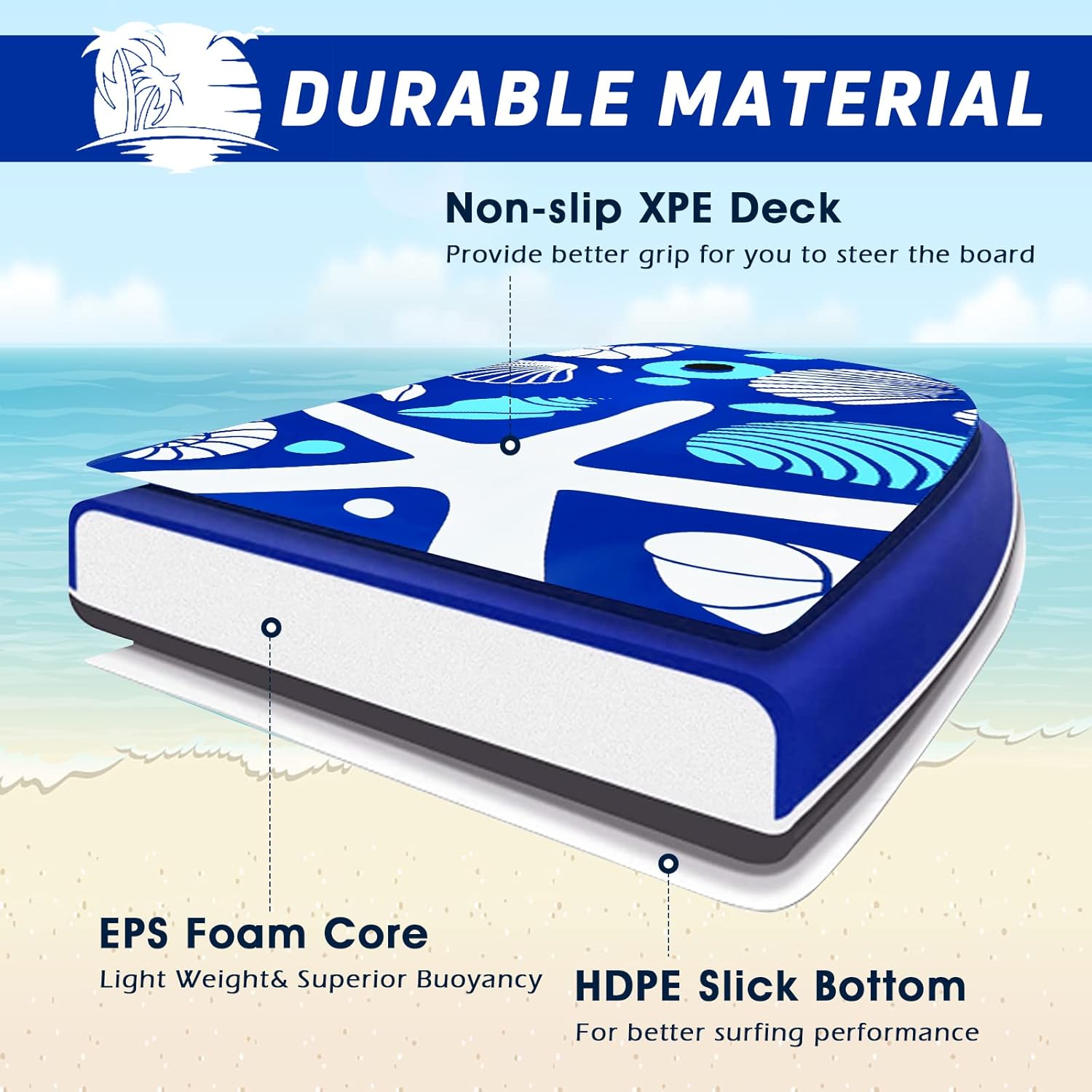 - [Premium Construction & Durability]: Engineered for premium performance, this bodyboard utilizes heat-sealed lamination technology to reinforce structural integrity and waterproofing. XPE deck resists impact, while the weatherproof EPS core delivers optimal buoyancy and shock absorption. Paired with smooth HDPE bottom, it allows for effortless, high-speed gliding.