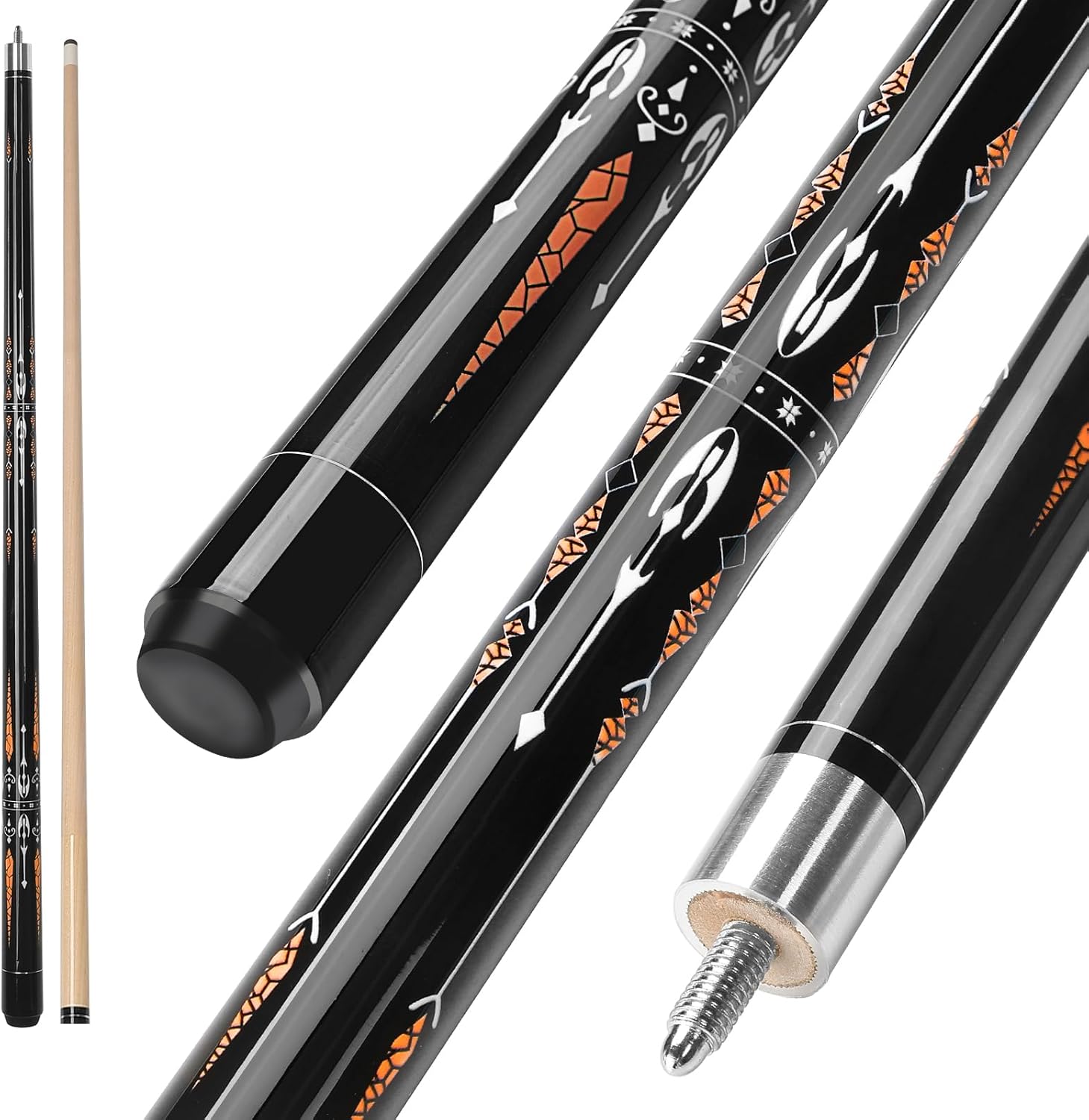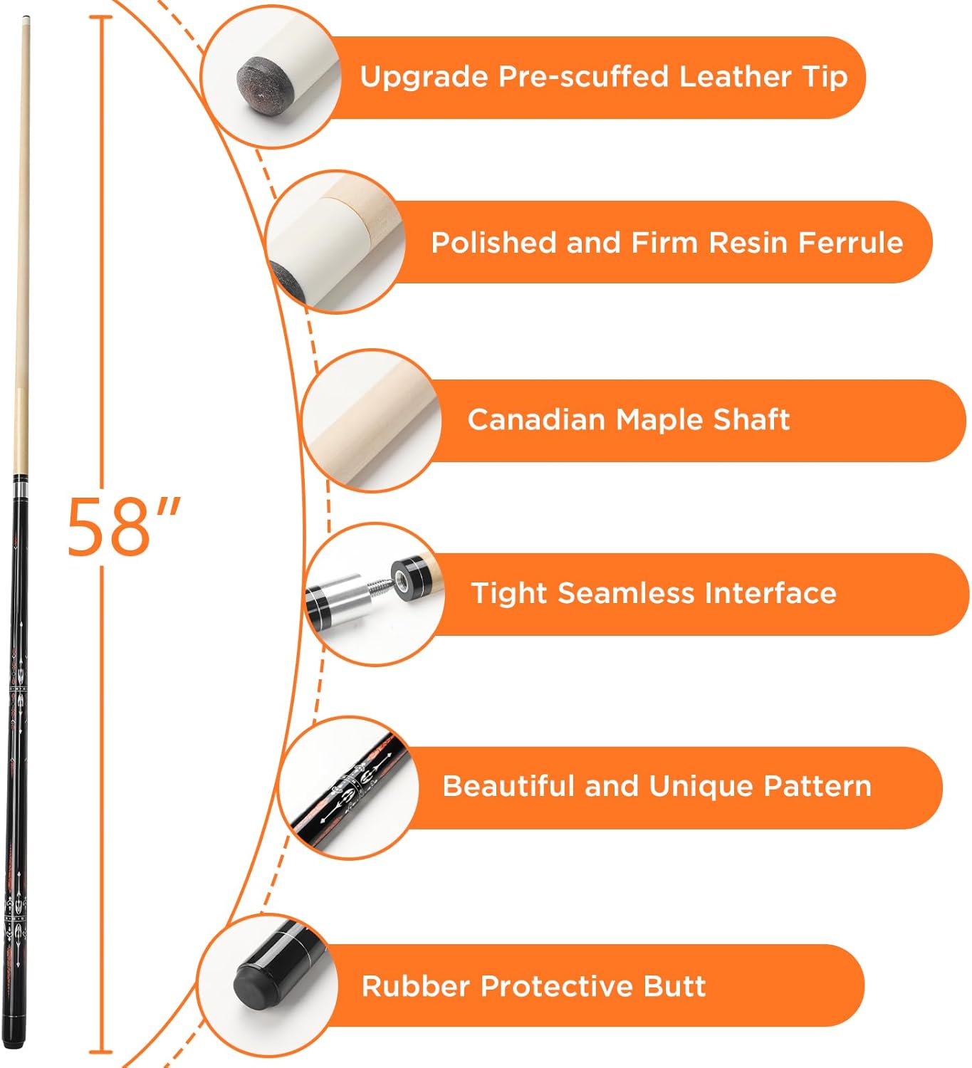 - 🎱【Specifications】 58-inch length (147 cm) & 18oz weight (510g) for optimal balance and control. Durable 13mm leather tip delivers precise cue ball contact. Easy-assembly 2-piece design screws together securely; feels seamless like a one-piece cue.