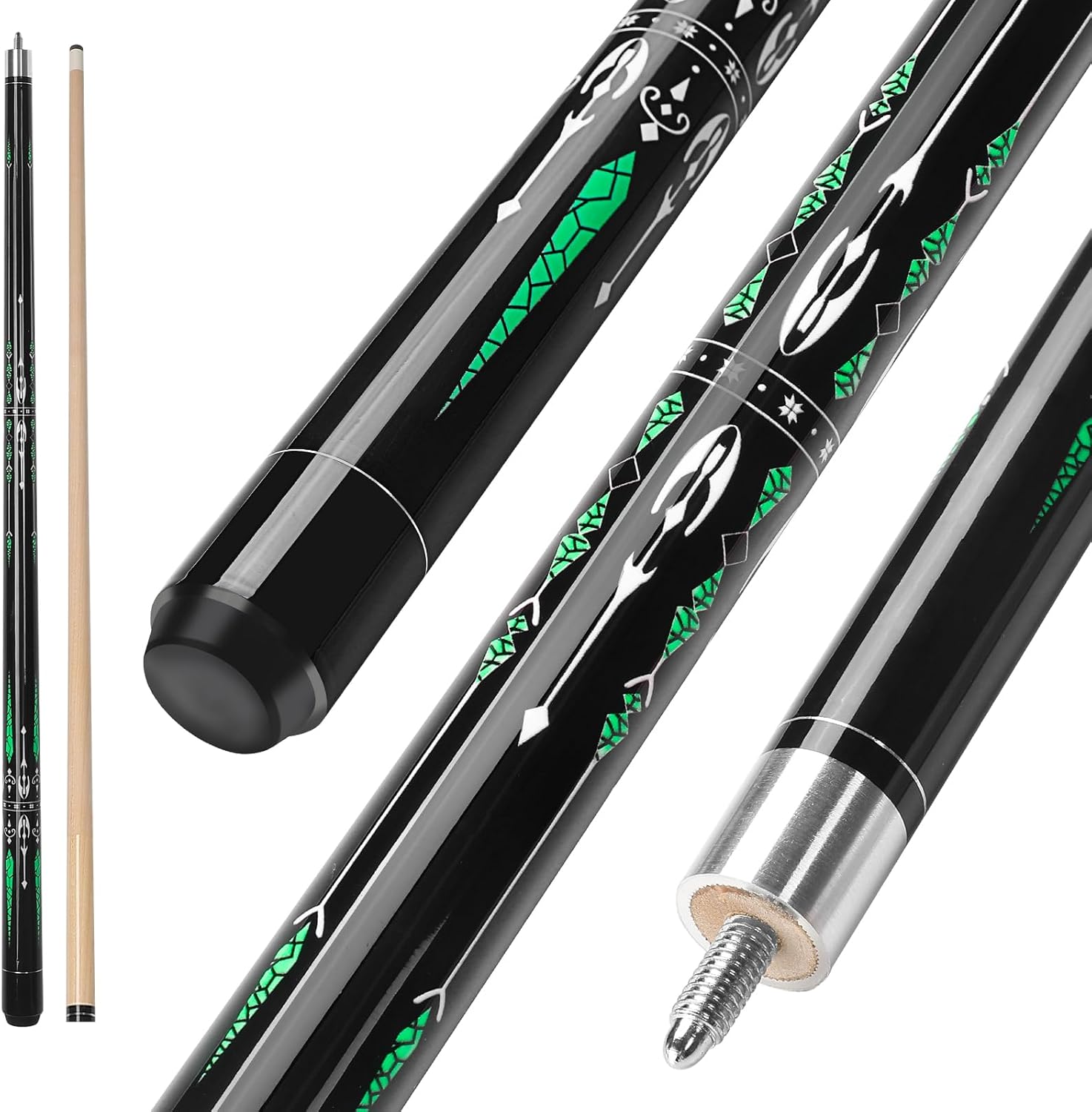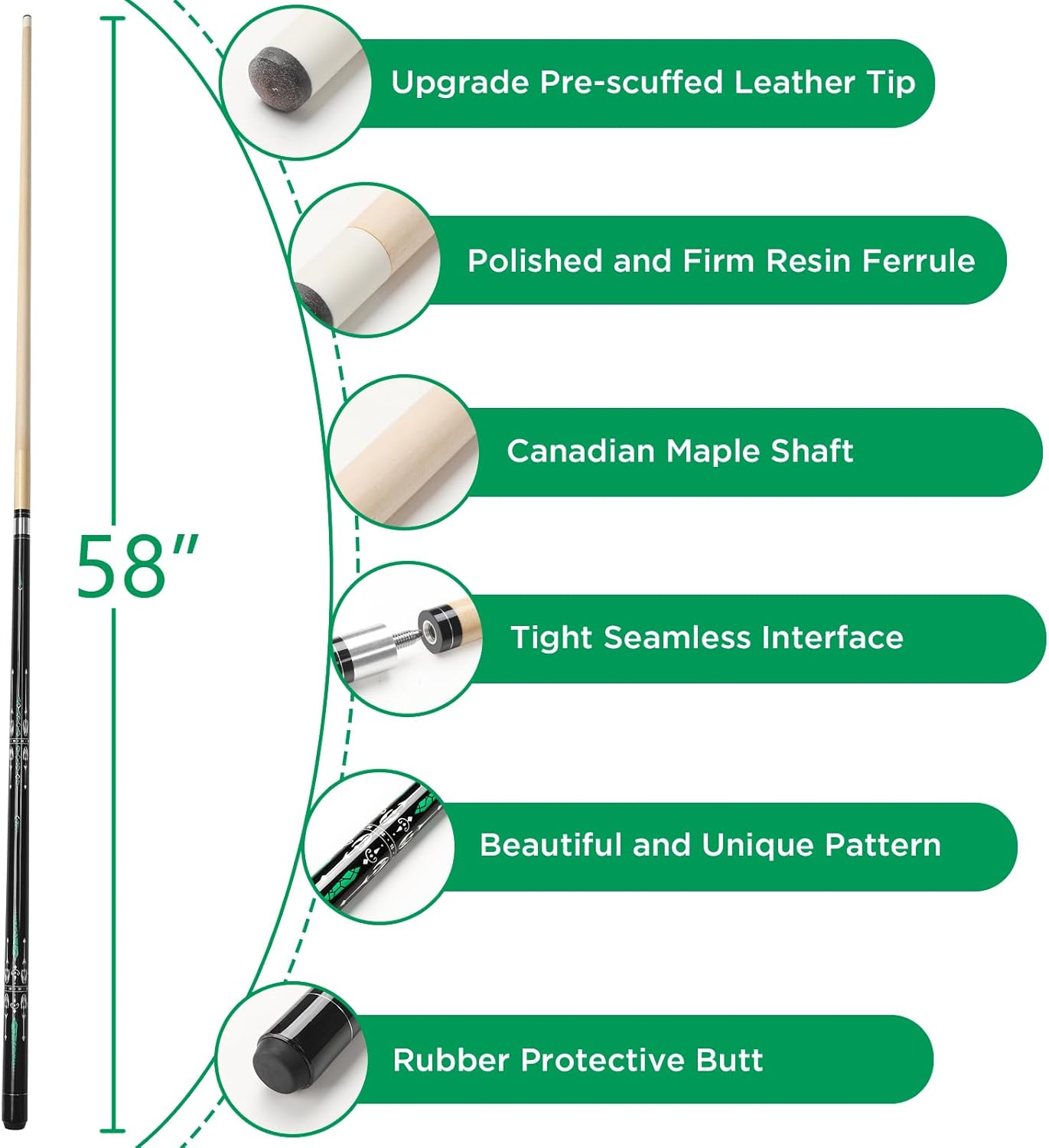 - 🎱【Specifications】 58-inch length (147 cm) & 20oz weight (567g) for optimal balance and control. Durable 13mm leather tip delivers precise cue ball contact. Easy-assembly 2-piece design screws together securely; feels seamless like a one-piece cue.