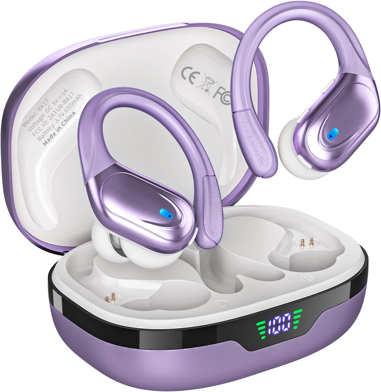 Wireless Earbuds, Sports Bluetooth Headphones, 80Hrs Playtime Ear Buds with LED Power Display, Noise Canceling Headset, IPX7 Waterproof Earphones for Workout/Running (Purple)