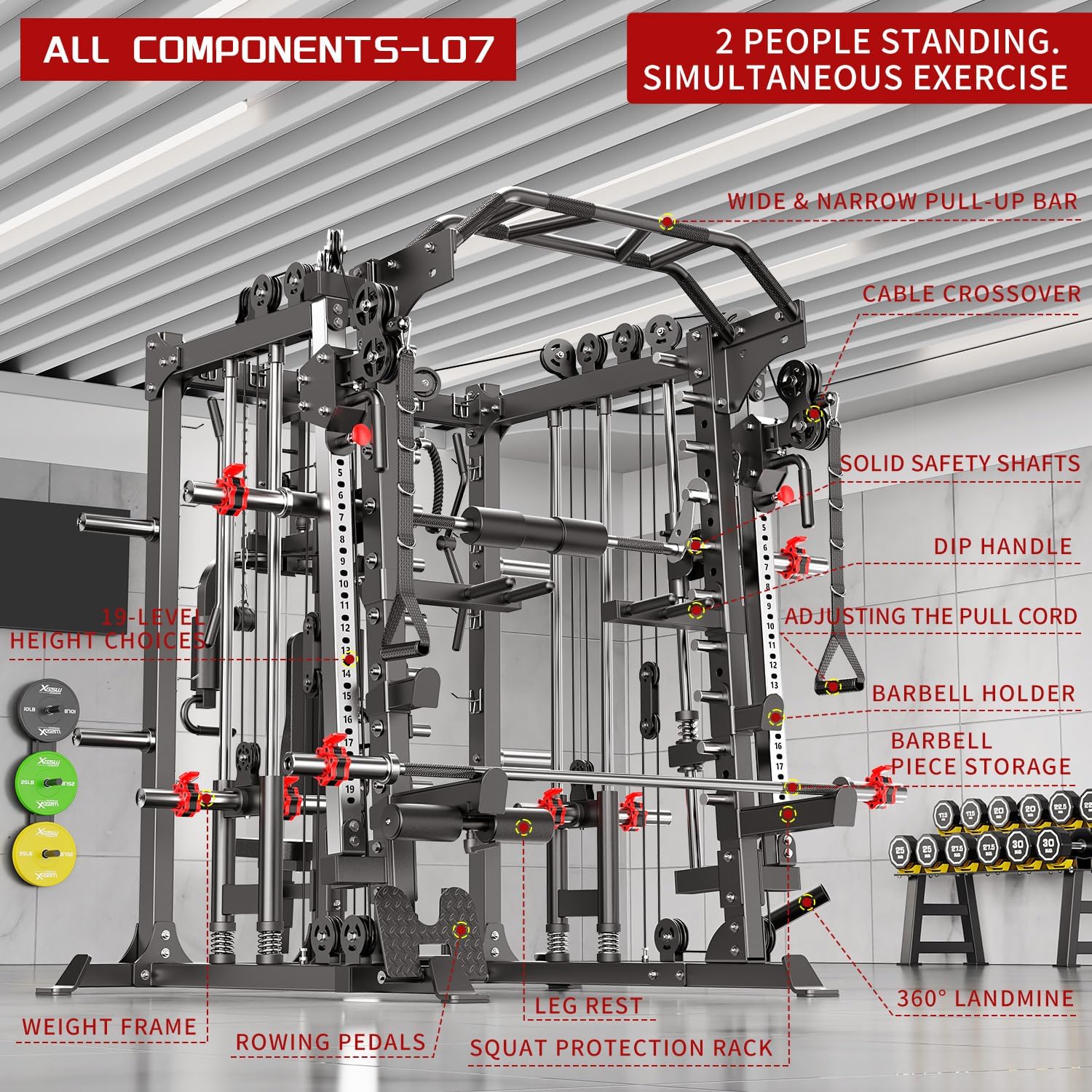 - The L07 smith machine is a powerhouse, combining multiple machines like chest fly, lat pulldown, seated cable row, cable crossover, half rack, squat, and pull-up station. You can do a full body workout at home.They are perfect for all your workout and home gym storage needs!